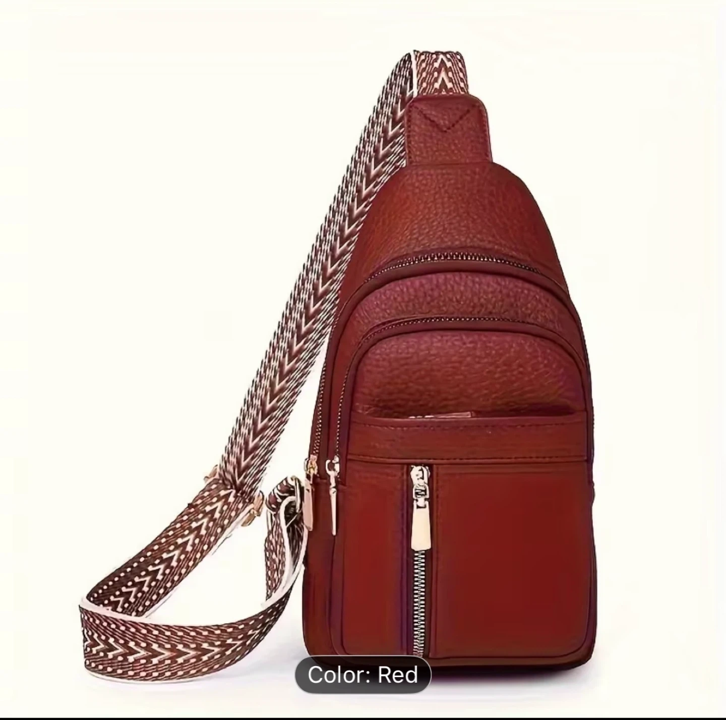 A vantage stylish red sling bag, perfect for carrying your essentials! The bag features a patterned strap and multiple zippered compartments to keep your belongings organized.