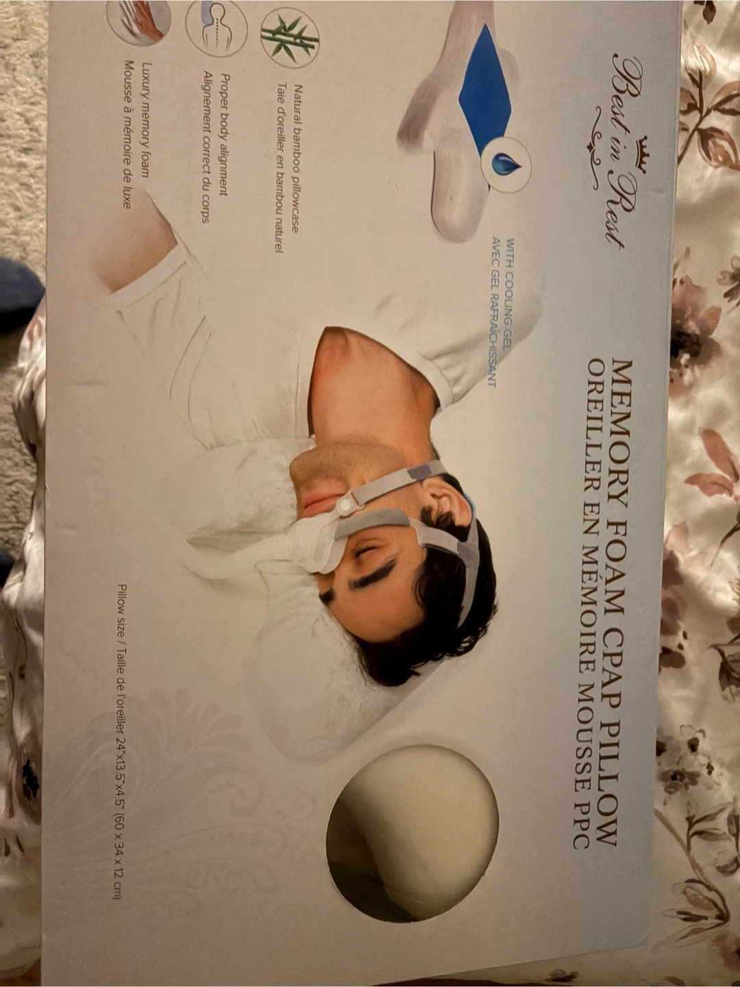 I'm selling a Best in Rest memory foam CPAP pillow! It comes with cooling gel and a natural bamboo pillowcase. It's designed for proper body alignment and made with luxury memory foam. The pillow size is 24"x13.5"x4.5" (60 x 34 x 12 cm)