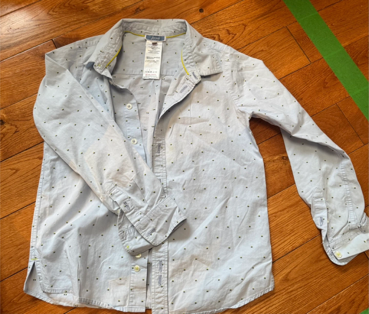 This is a cute Jacadi button-up shirt for kids. It's a light blue colour with a subtle dotted pattern. Made of soft fabric for comfort. Perfect for dressing up or everyday wear!