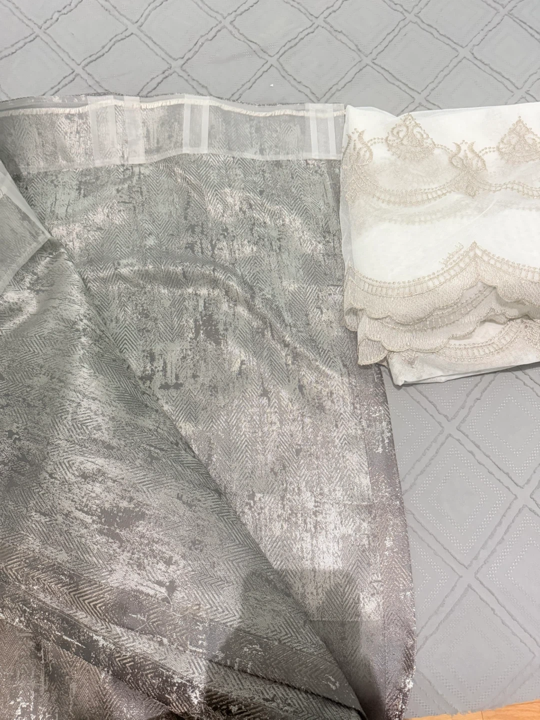 These decorative 4 Pieces curtain panels feature a textured, metallic sheen with a herringbone pattern. They include a sheer lace overlay panel for added elegance. Light filtering and beautiful!