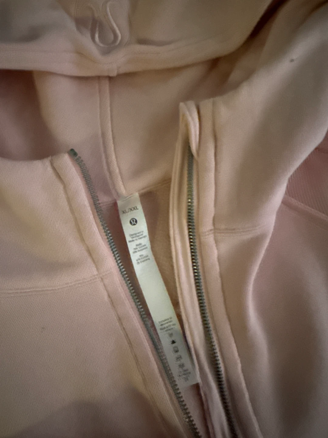 This is a Lululemon Scuba Oversized Half-Zip Hoodie in Pink Mist. It's a size XL/XXL. The hoodie is made of a soft cotton blend material. It's perfect for everyday wear!