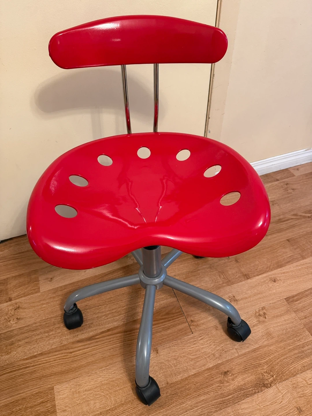 This red office chair features a fun, saddle-shaped seat with drainage holes. It's adjustable for height and has a sturdy base with casters for easy movement. Perfect for a home office or craft room!