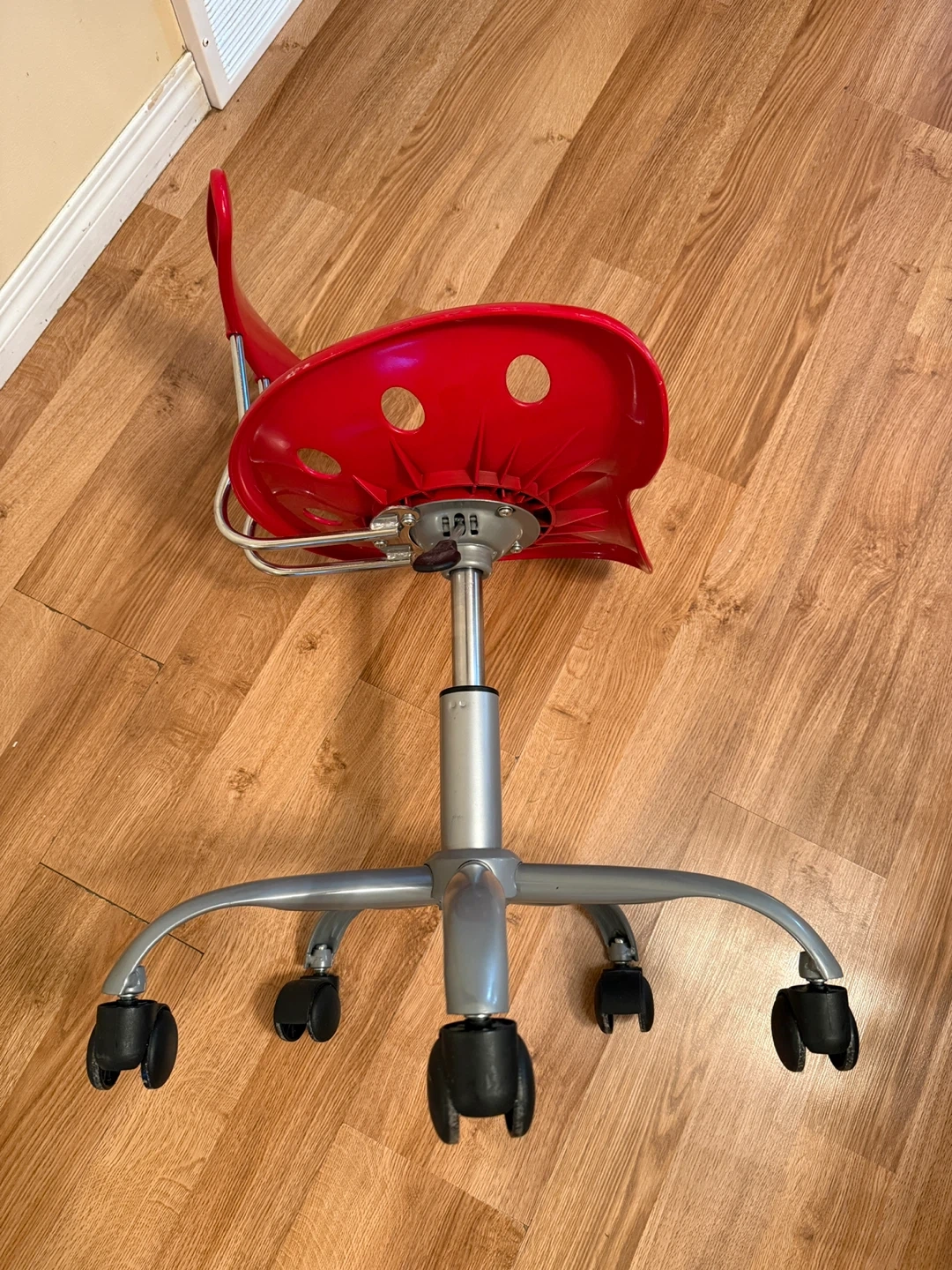 This red office chair features a fun, saddle-shaped seat with drainage holes. It's adjustable for height and has a sturdy base with casters for easy movement. Perfect for a home office or craft room!