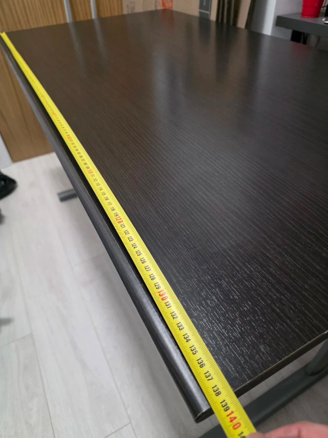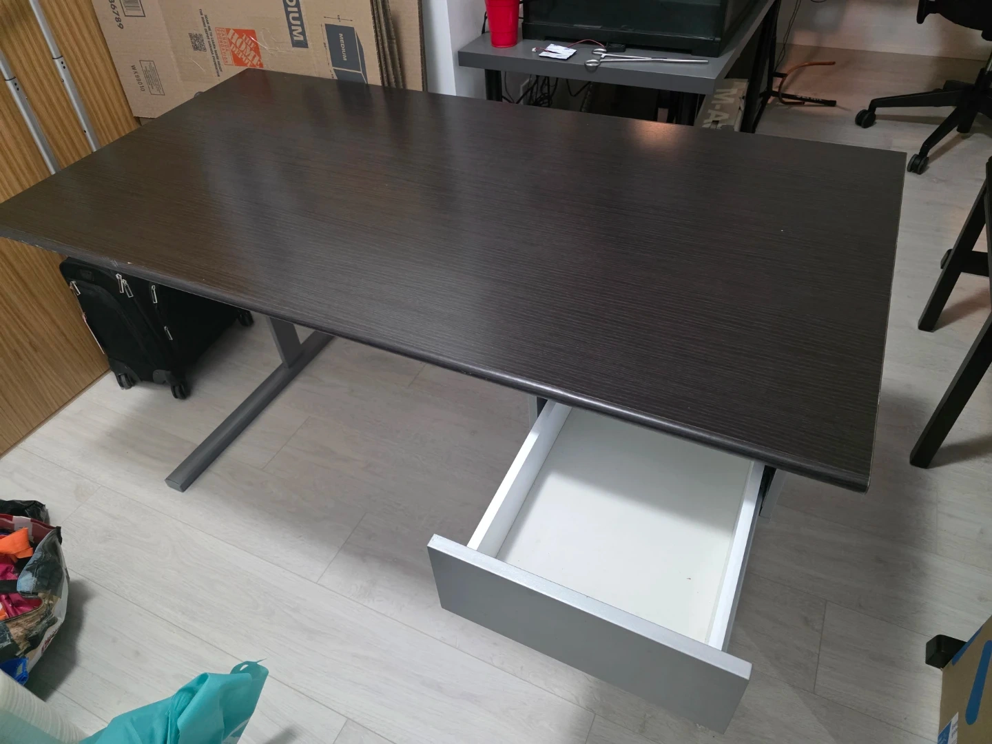 This desk has a dark wood laminate top and a grey metal frame. It features one pull-out drawer for storage.