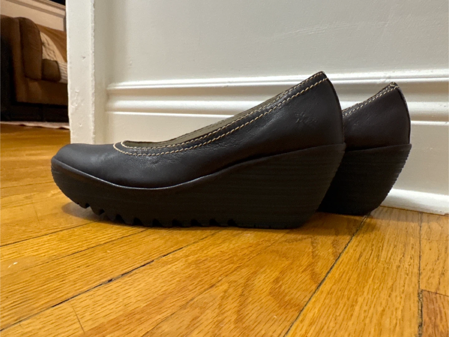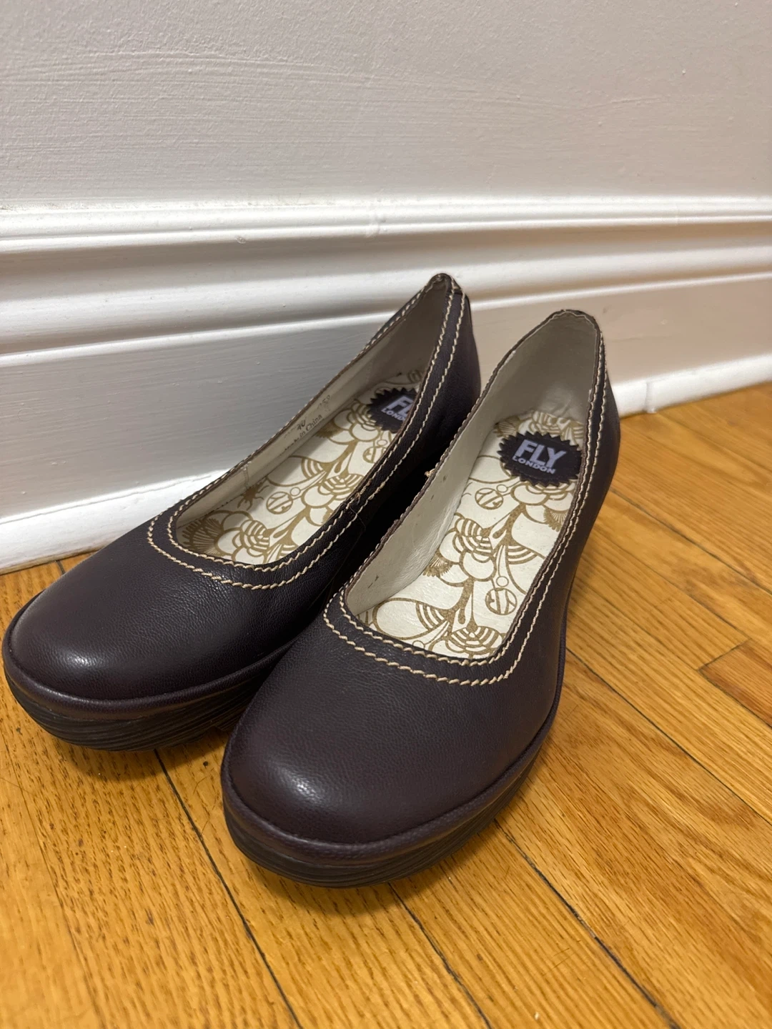 These FLY LONDON wedge shoes are made of brown leather. They feature a classic pump silhouette with decorative stitching. The wedge heel provides a comfortable lift.