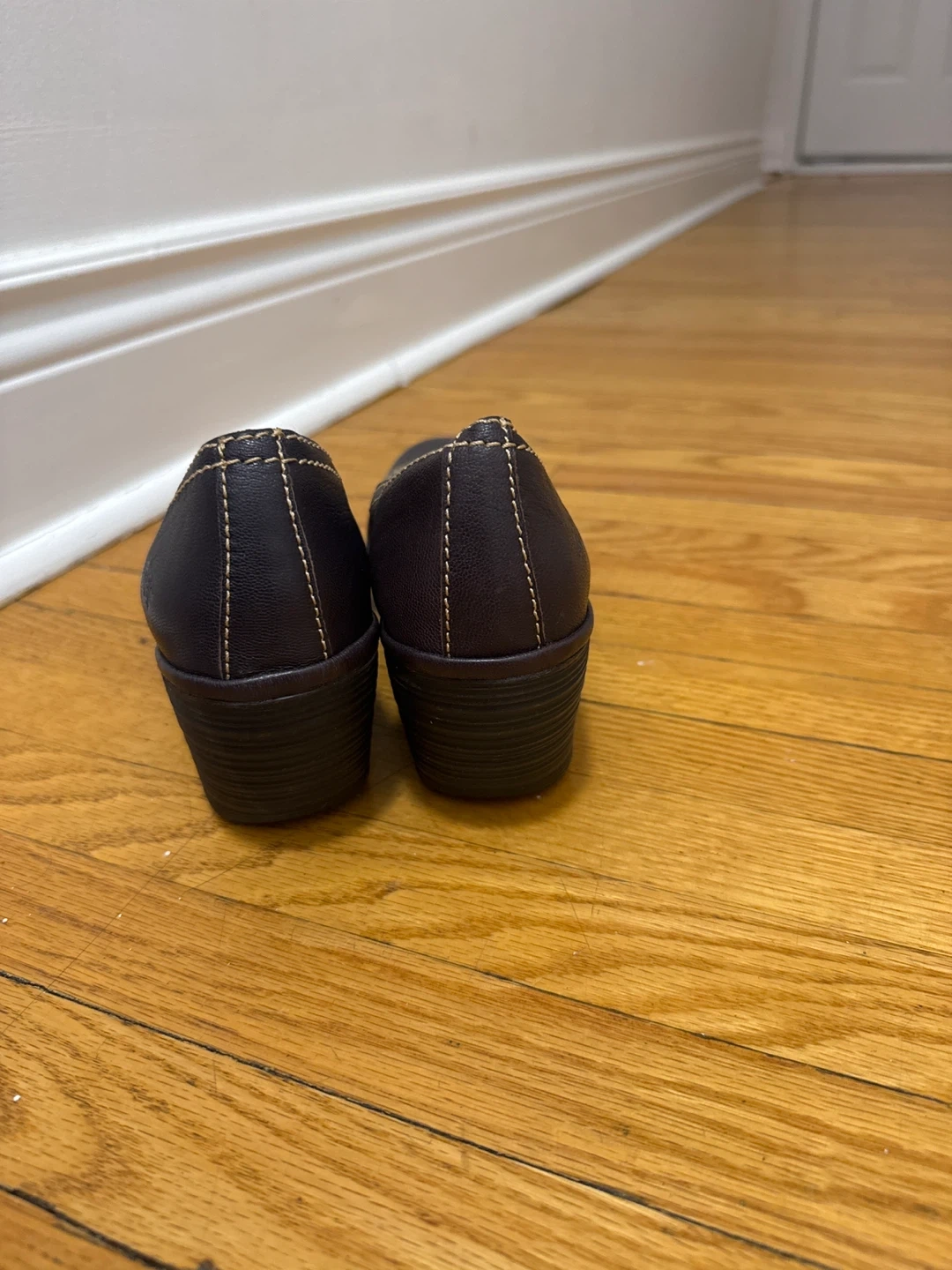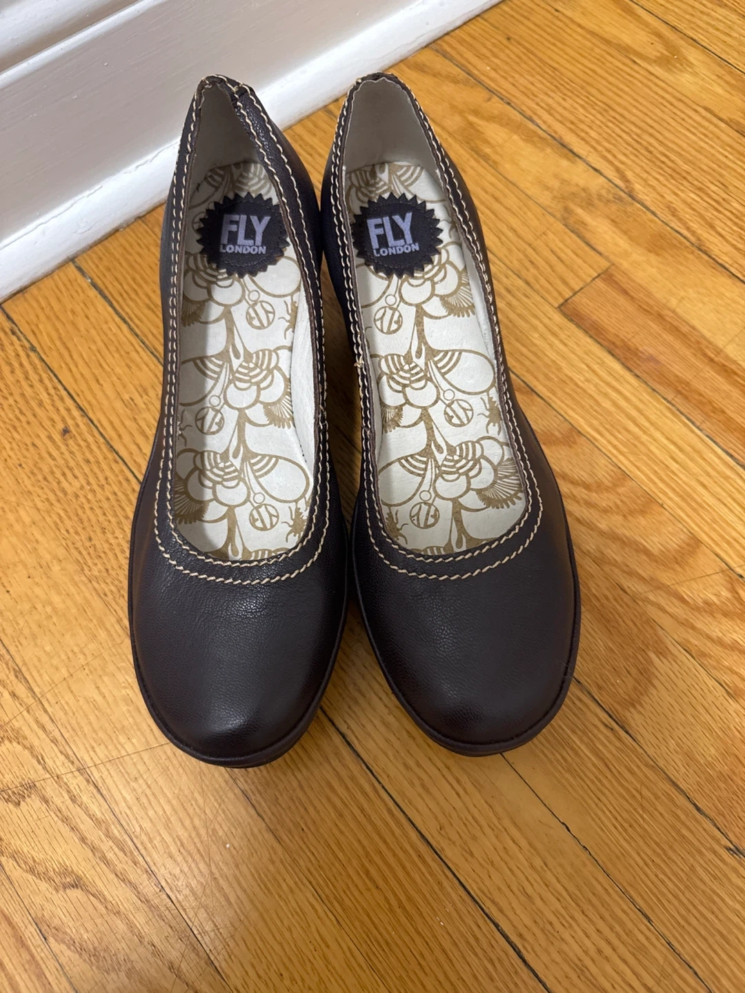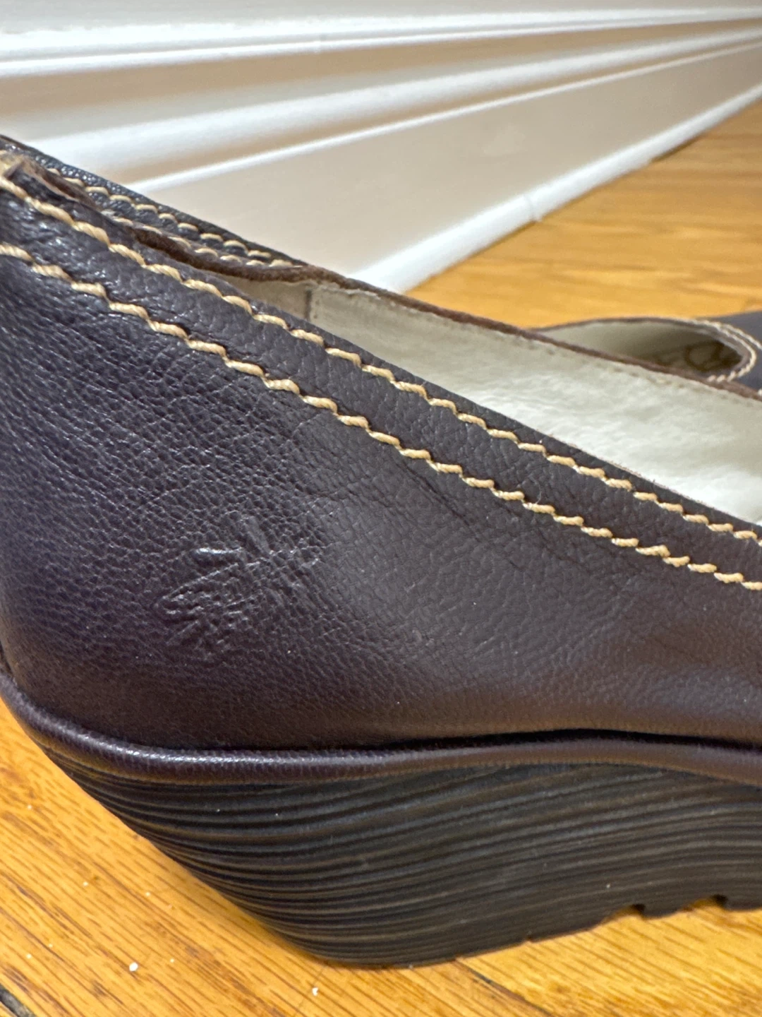 These FLY LONDON wedge shoes are made of brown leather. They feature a classic pump silhouette with decorative stitching. The wedge heel provides a comfortable lift.