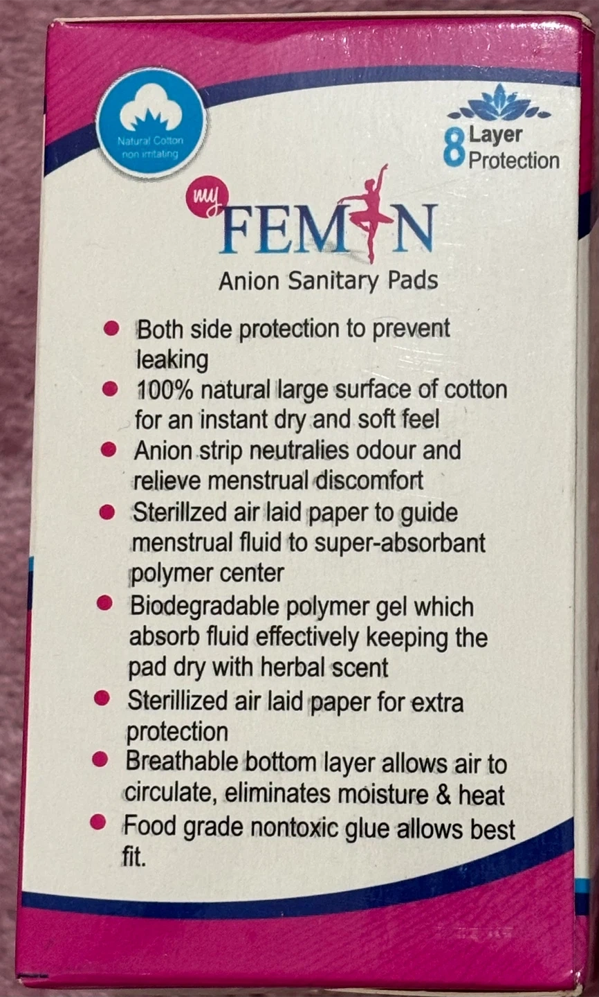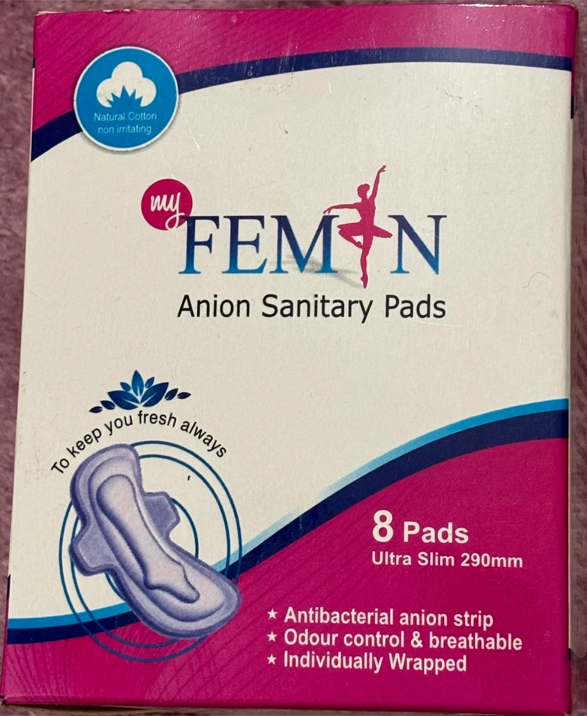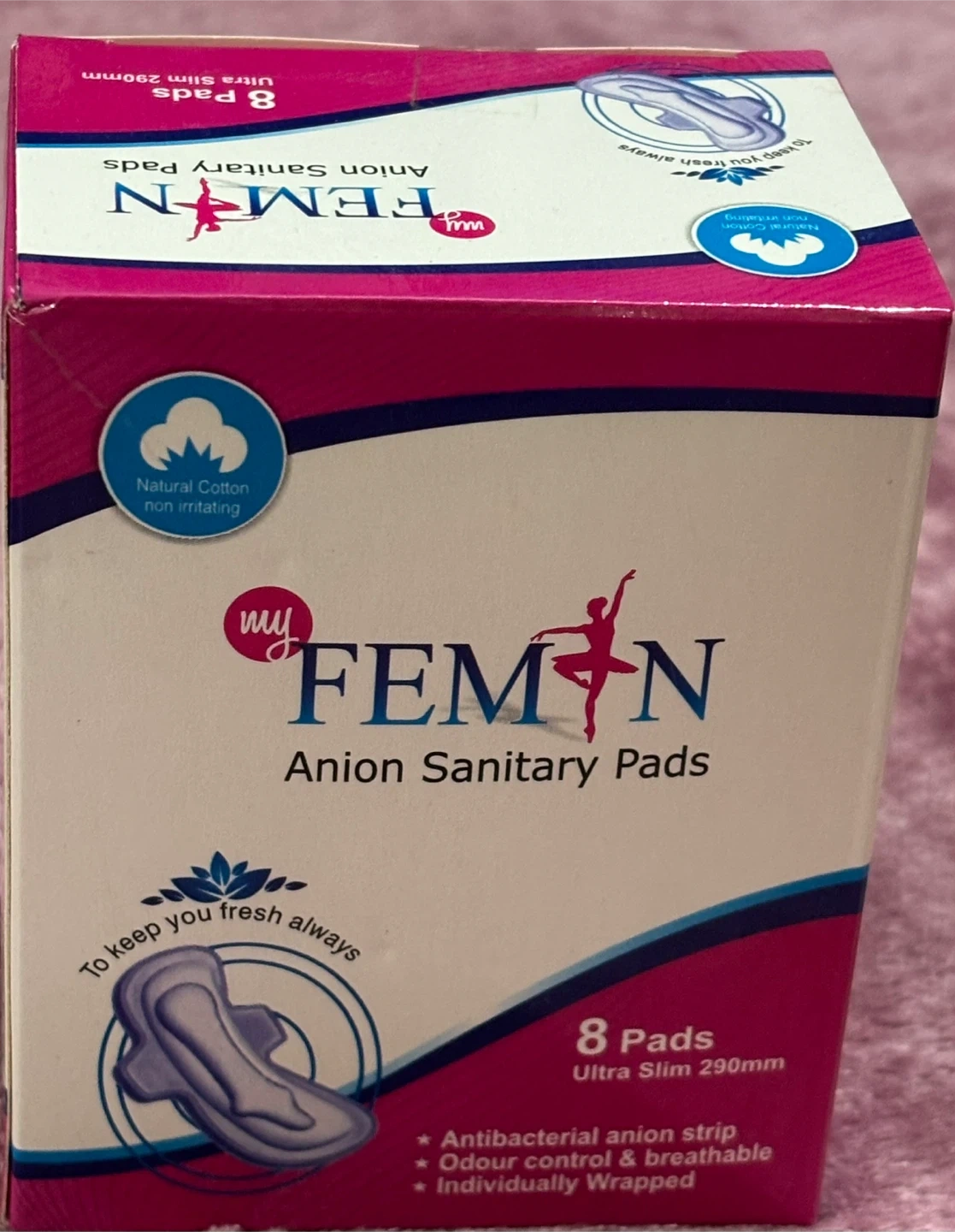 These are my FEMIN Anion Sanitary Pads, ultra slim at 290mm. The box contains 8 individually wrapped pads. Features natural cotton, antibacterial anion strip, and odour control for a fresh feel.