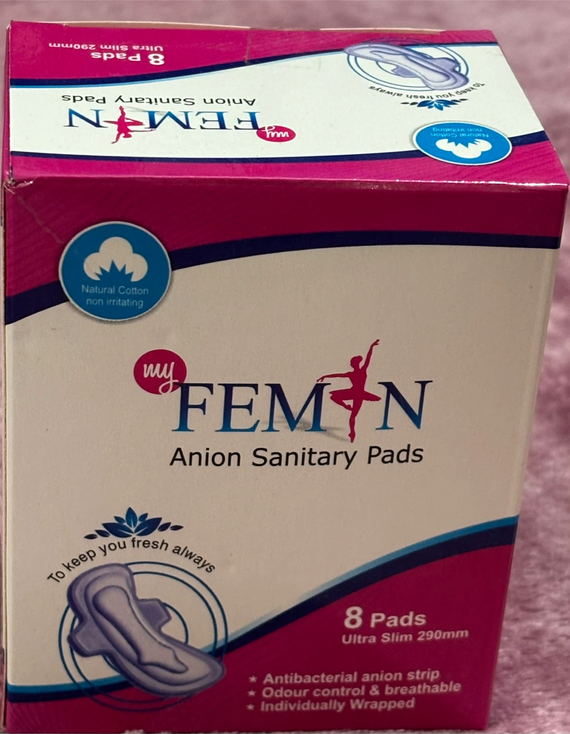 These are my FEMIN Anion Sanitary Pads, ultra slim at 290mm. The box contains 8 individually wrapped pads. Features natural cotton, antibacterial anion strip, and odour control for a fresh feel.