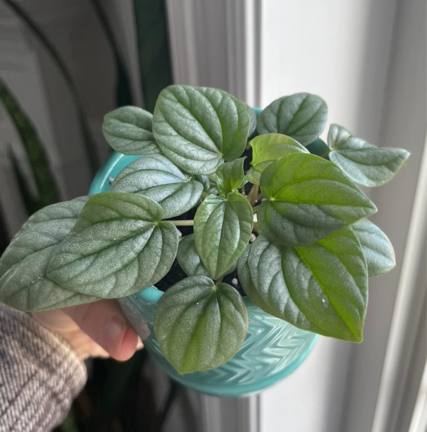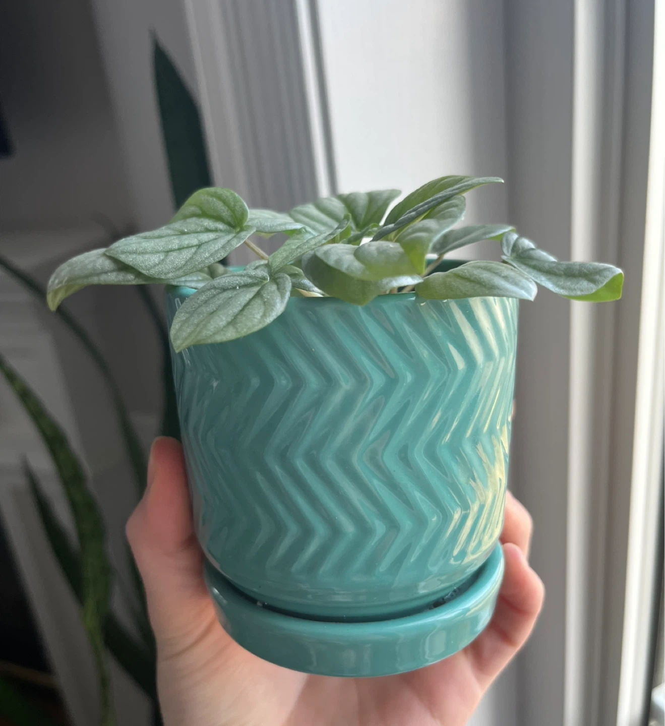 Peperomia plant in teal chevron pot