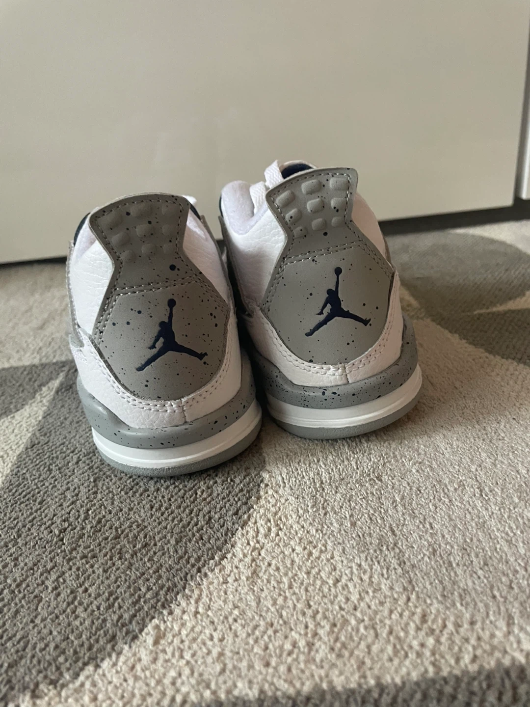 Toddler Jordan 4 Retro (PS) shoes. White with midnight navy accents. Size 11