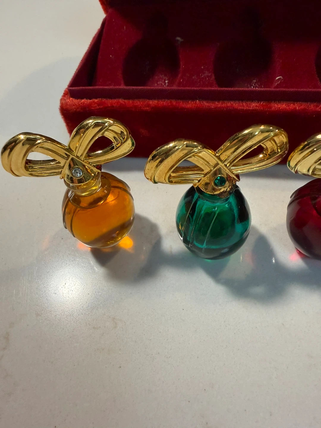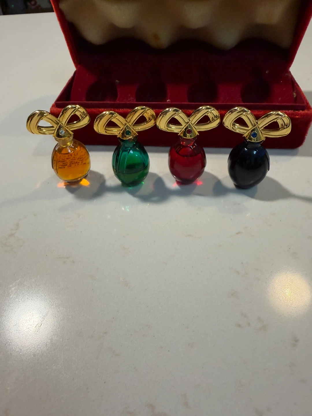 Elizabeth Taylor’s vintage collection set of miniature perfume ornaments, complete with their original red velvet box! These decorative perfume bottles feature a gold-tone bow design and come in a variety of colours: amber, green, red, and black All have perfume in them except for the green one is only half full.