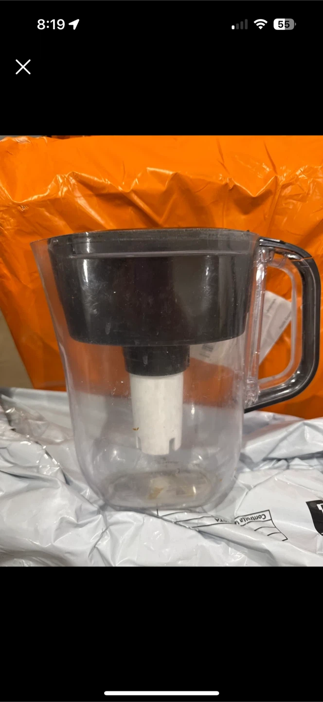 Brita water filter pitcher with a black lid and clear body. It's designed to hold a filter cartridge for purified drinking water. This pitcher helps improve the taste and quality of tap water.