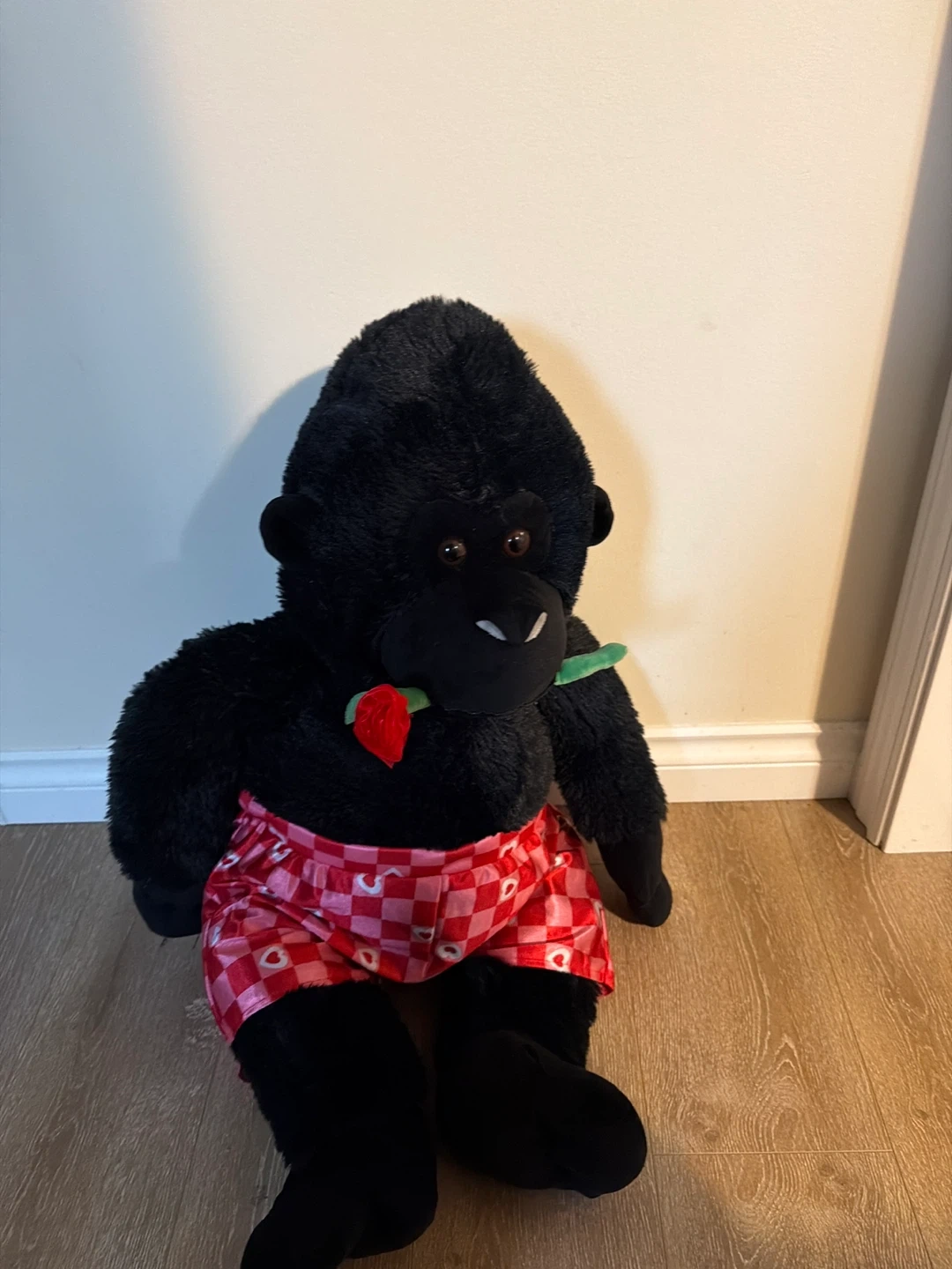 This is a soft, black plush gorilla toy. It's wearing red and pink checkered boxers with white hearts. It also holds a red rose with a green stem. This cuddly friend would make a fun gift!