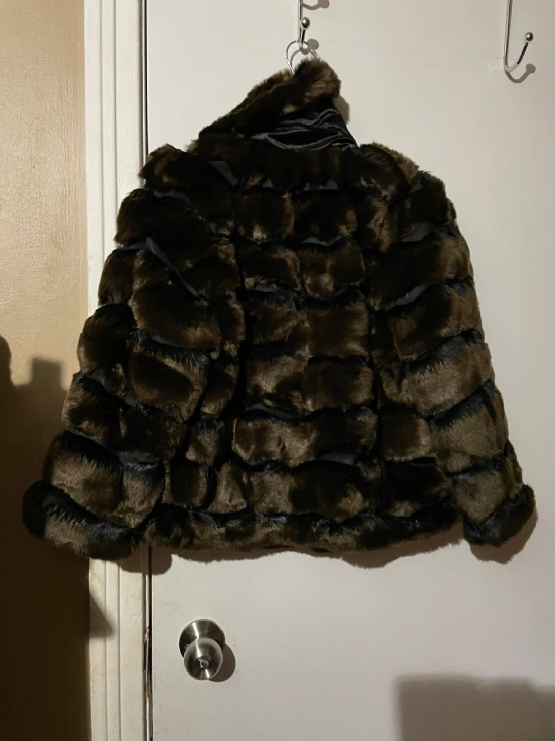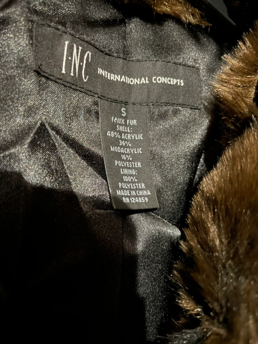 Selling a stylish INC International Concepts faux fur coat. It's a size small and features a shell made of 48% acrylic, 36% modacrylic, and 16% polyester. The lining is 100% polyester. Perfect for adding a touch of warmth and style to your wardrobe!