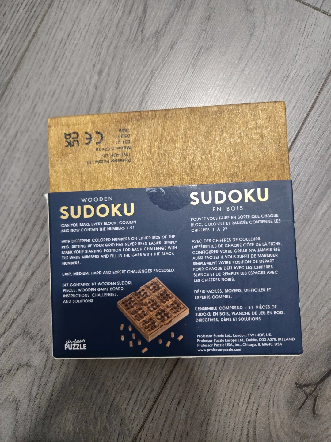Test your wits with this collection of classic Sudoku puzzles. Includes 81 wooden Sudoku pieces, a wooden game board, instructional challenges, and solutions. Suitable for ages 9+ and 1+ players.