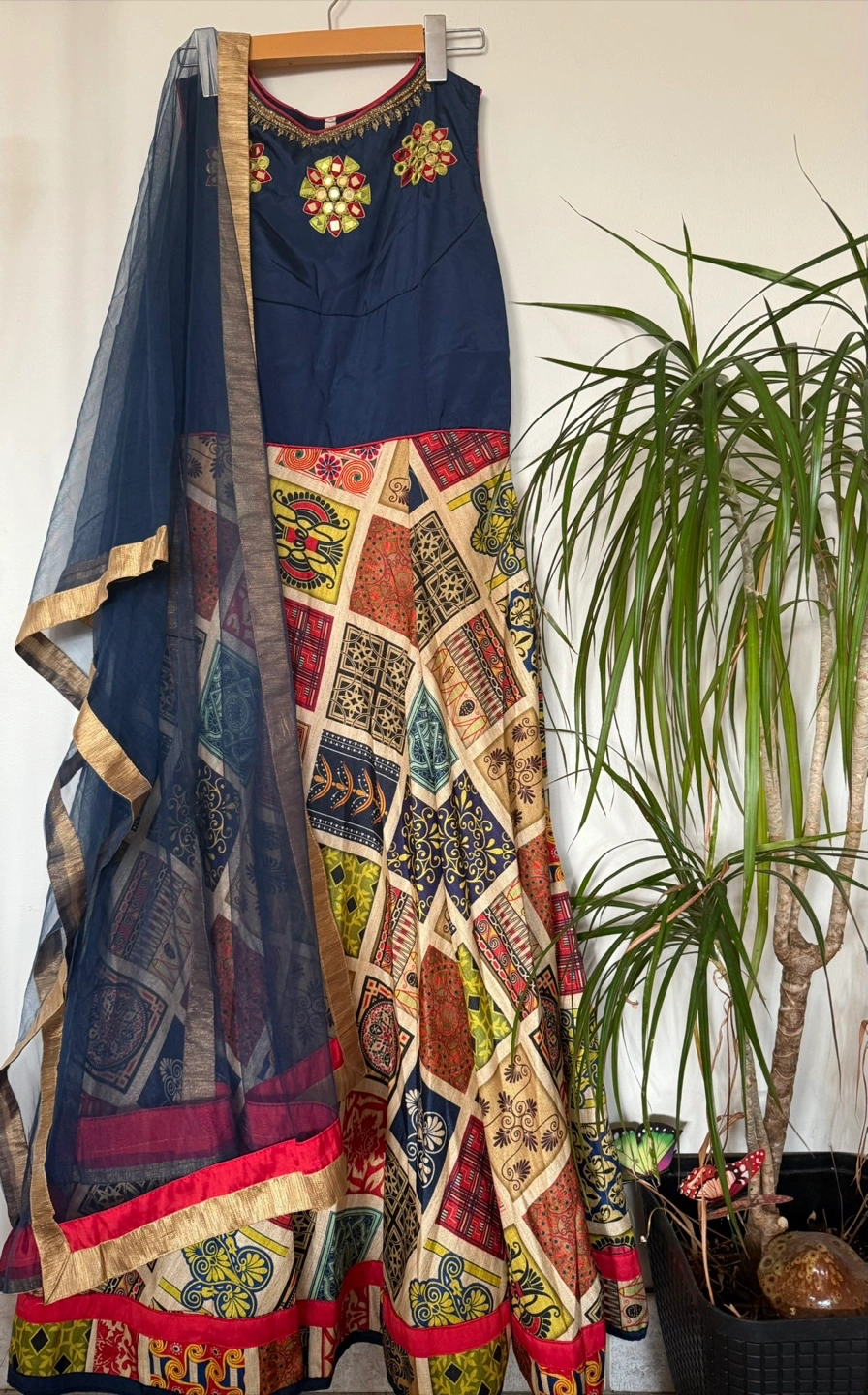 73Beautiful Indian Anarkali dress with a matching dupatta. The dress features a navy blue bodice with intricate embroidery and mirror work. The skirt is a vibrant patchwork of colourful patterns. The dupatta is navy blue with a gold border. Perfect for special occasions! Also get this beautiful earrings for free