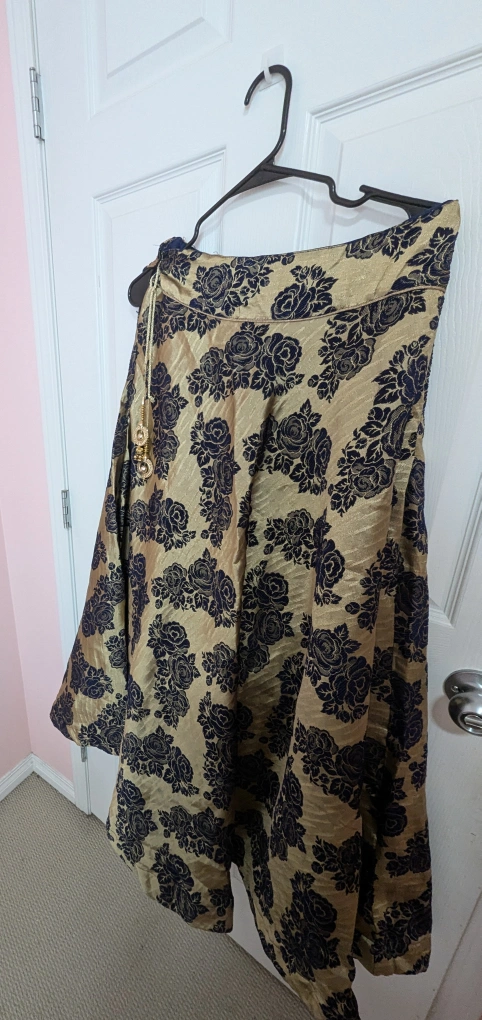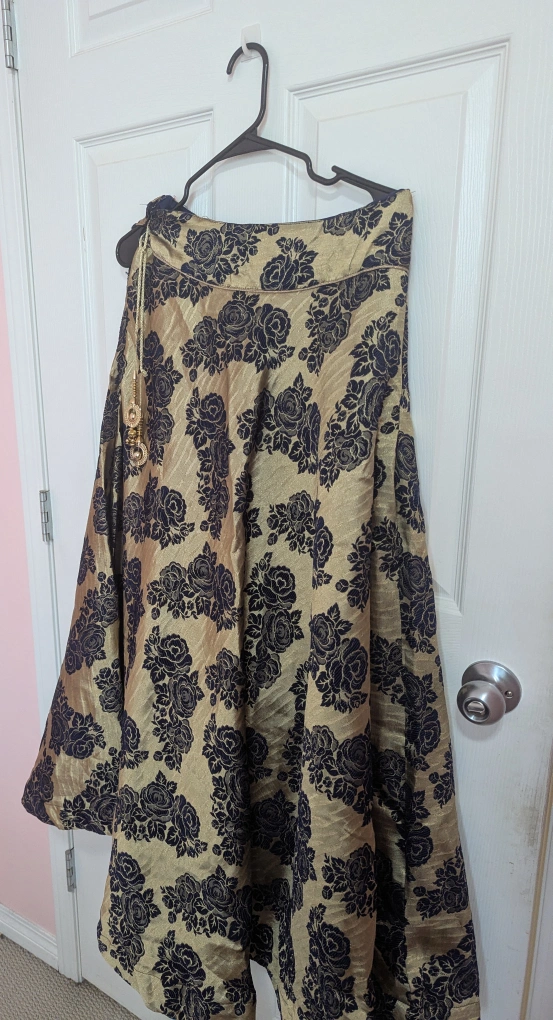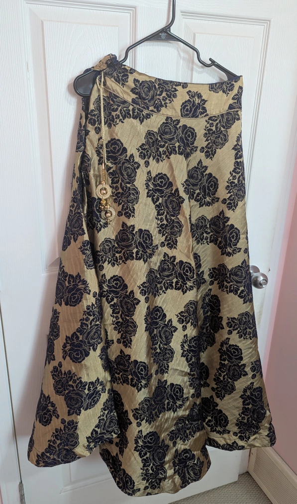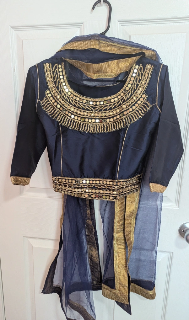 Dazzle at Your Next Event! ✨ For sale is a stunning Indian Lehenga Choli set. This elegant navy blue and gold outfit is perfect for weddings, receptions, festivals, or any grand celebration. You'll feel absolutely radiant in this beautiful ensemble! Set Includes: Choli (Blouse): A gorgeous navy blue blouse featuring intricate gold embroidery and traditional mirror work. Lehenga (Skirt): A flowing skirt with a beautiful gold and navy floral print that catches the light perfectly. Dupatta: A matching navy blue scarf to complete the look. Details: ✦ Excellent condition ✦ Cleaned and ready to wear ✦ From a smoke-free and pet-free home ✦ Fits Small to Medium Size