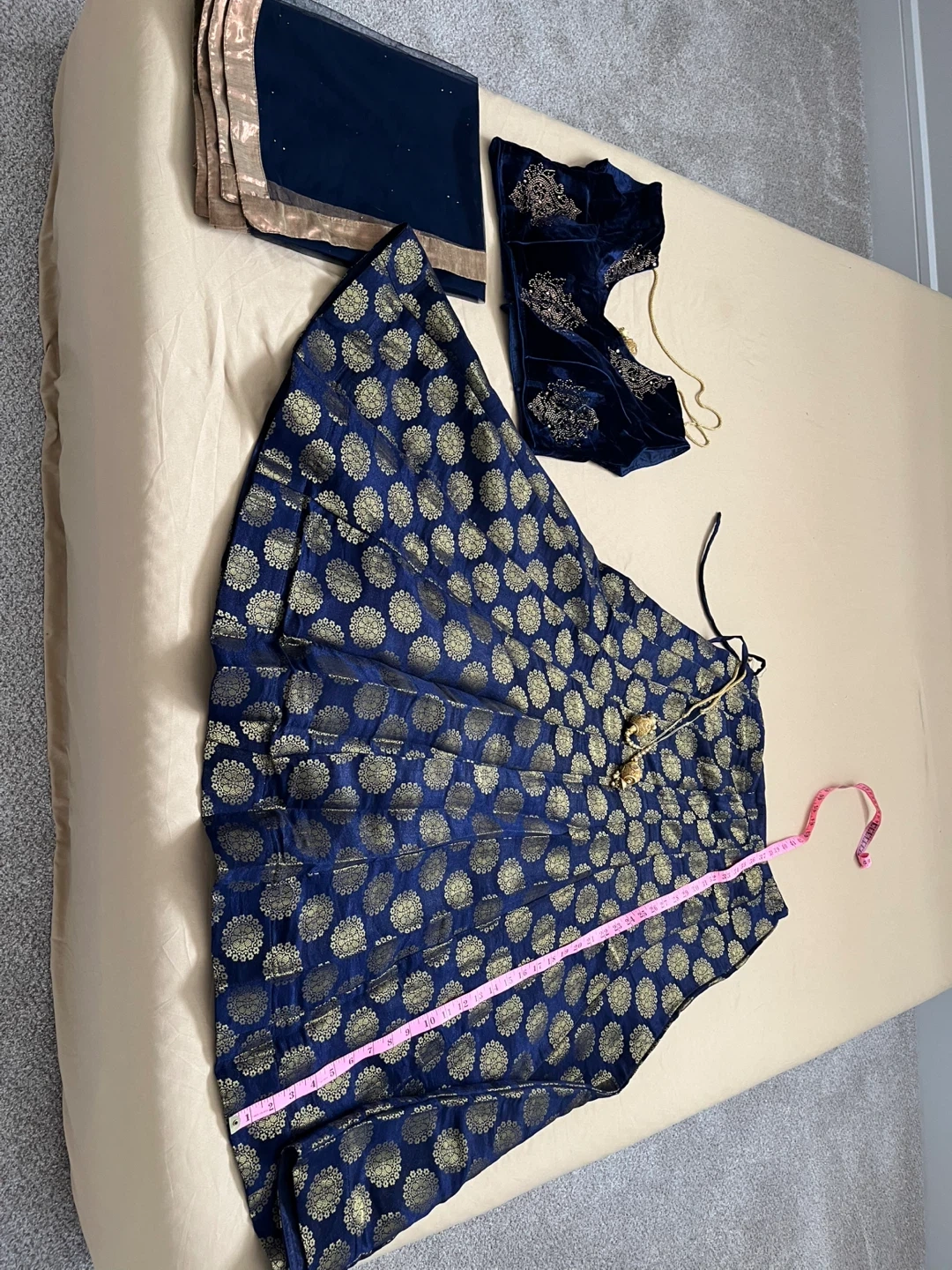 33Beautiful Indian outfit in blue and gold. The top is a dark blue velvet with gold embellishments. It looks to be about 15 inches in length. The skirt is a patterned blue and gold. Comes with a matching shawl.