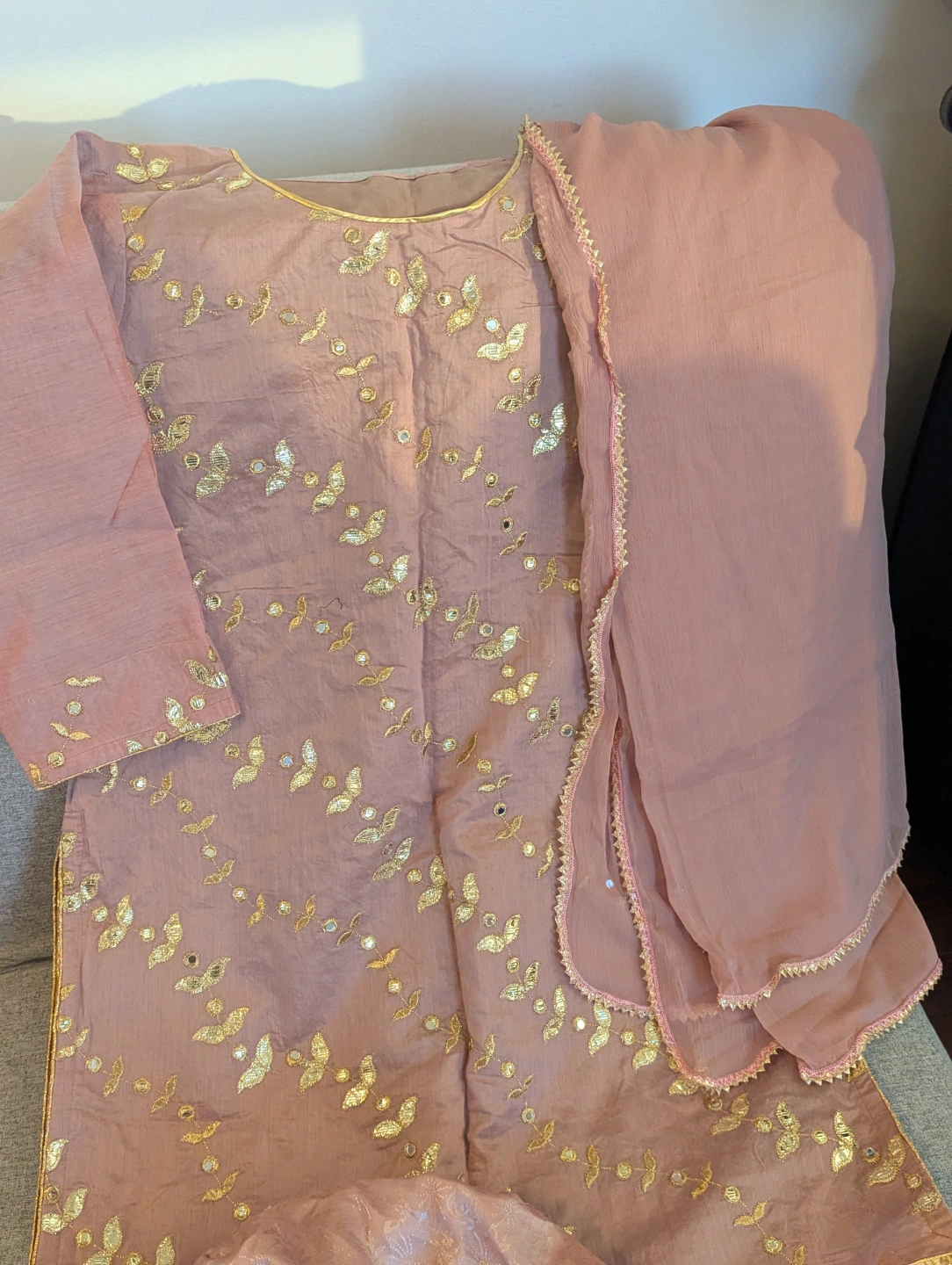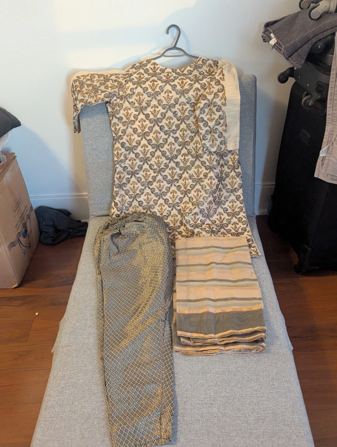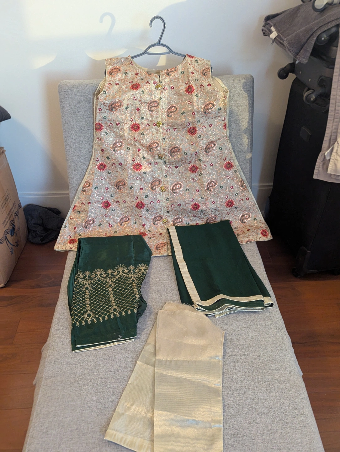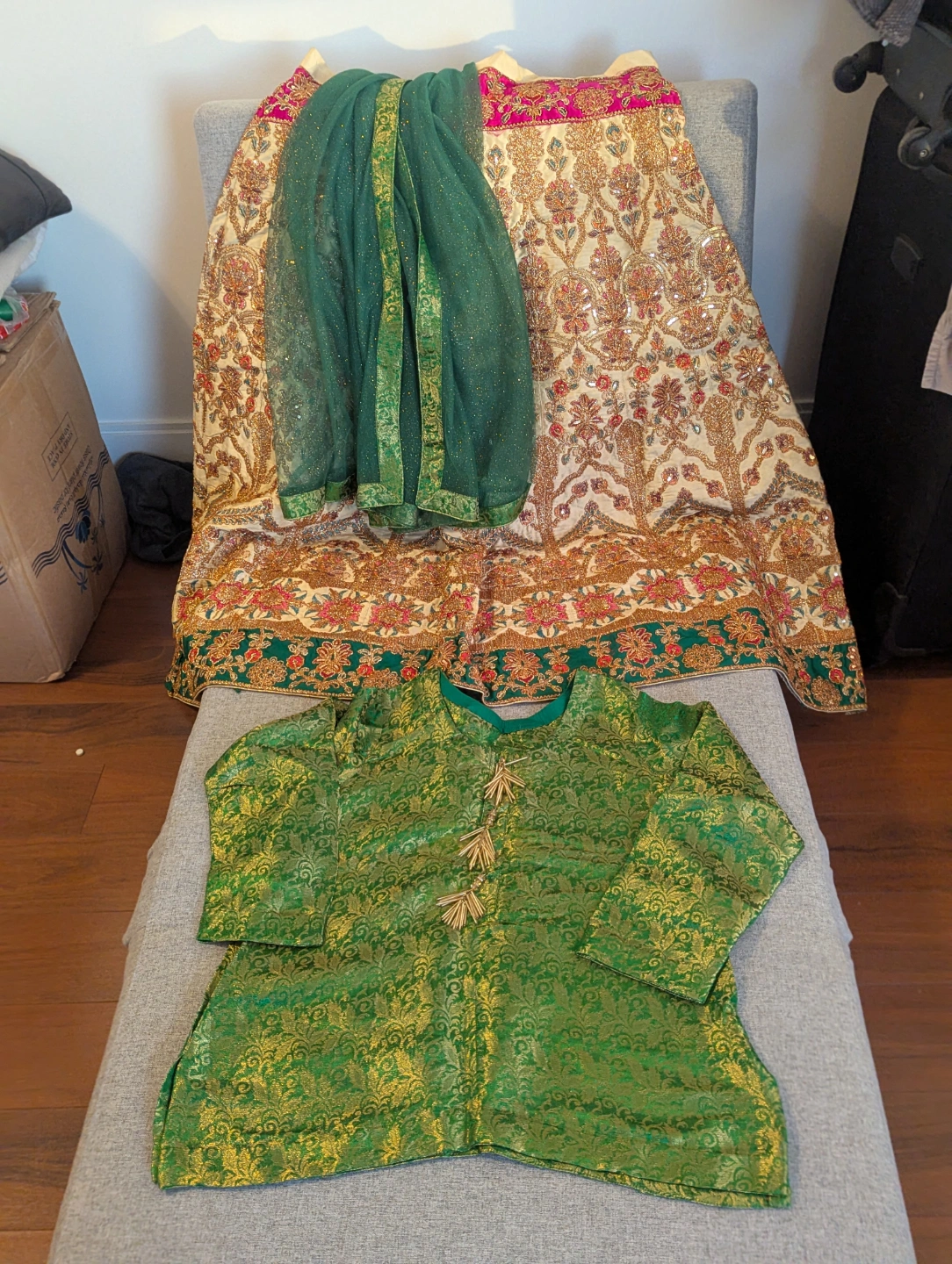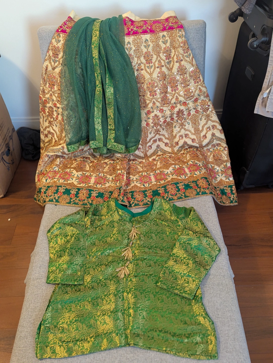 Indian Pakistani Fancy Party clothing. Includes a mauve kurta with gold embroidery and matching dupatta, a cream and gold lehenga choli with green dupatta, and a green kurta pajama. Perfect for special occasions or celebrations. All items are pre-owned.