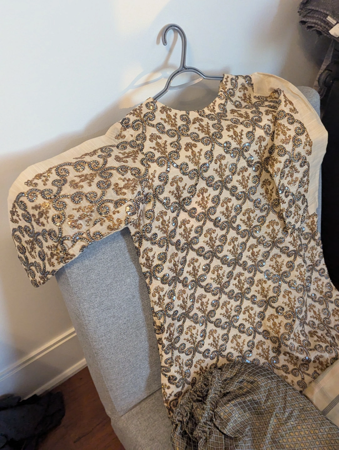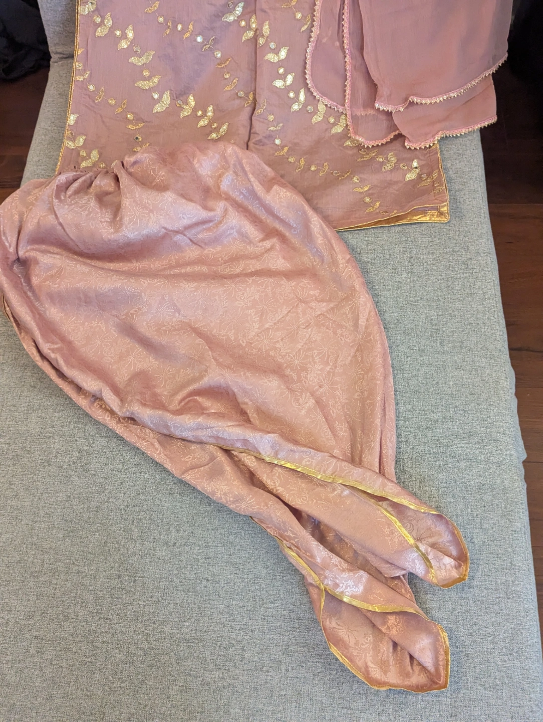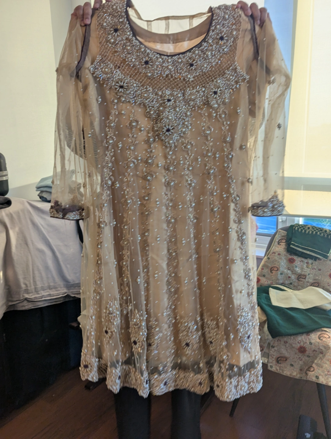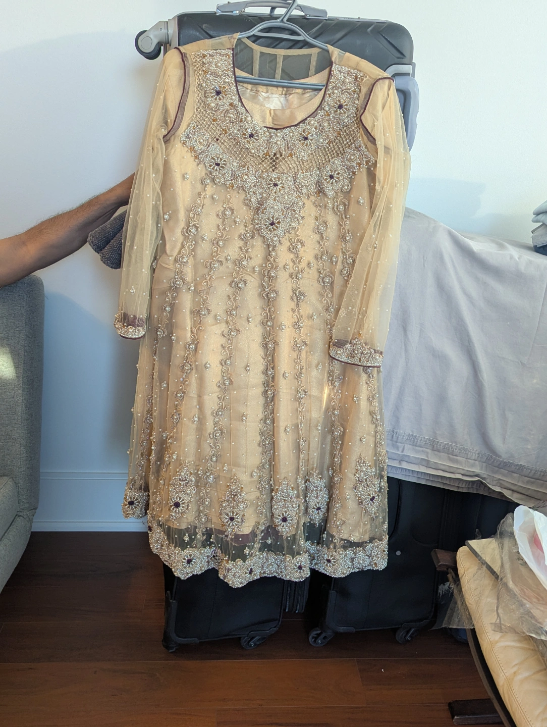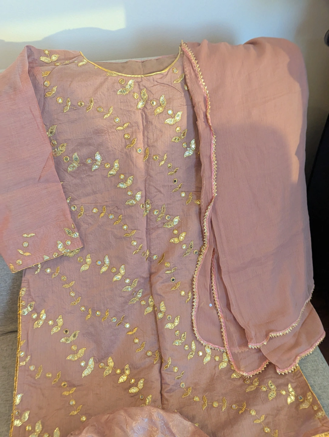 Indian Pakistani Fancy Party clothing. Includes a mauve kurta with gold embroidery and matching dupatta, a cream and gold lehenga choli with green dupatta, and a green kurta pajama. Perfect for special occasions or celebrations. All items are pre-owned.