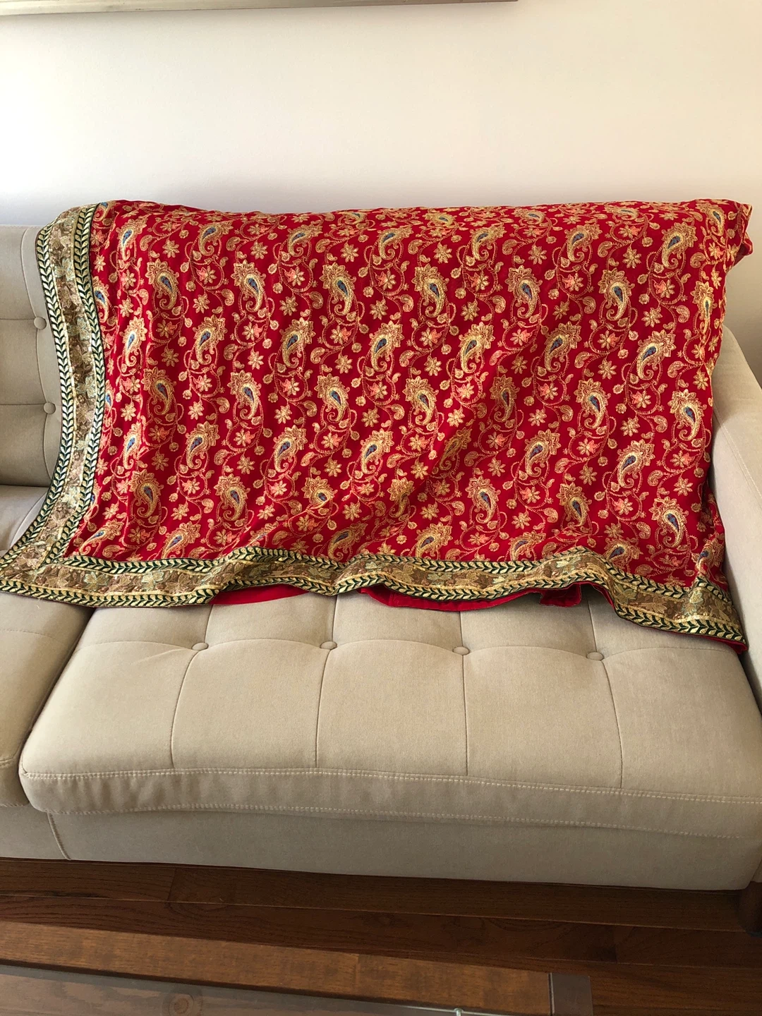 10Selling a beautiful red Saari with intricate Hold design It's in great condition and good for a party wearThe fabric feels soft and luxurious. It is in good condition. Fall fixed and the sides are stitched ready to wear.