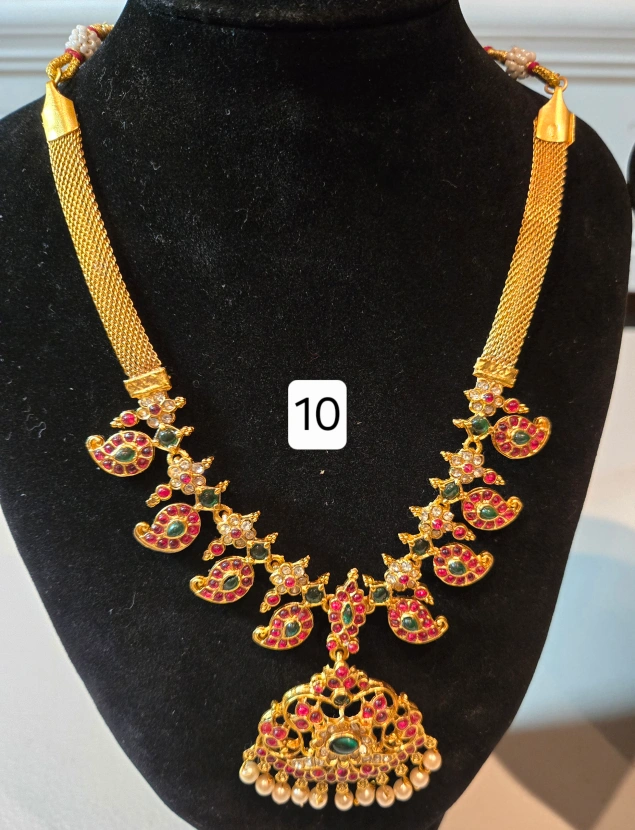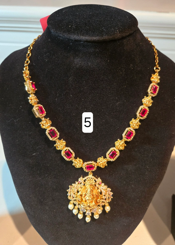 Selling a beautiful gold-tone necklace with an Indian-inspired design. It features intricate detailing and a lovely combination of gold, red, and pearl accents. These are brand new and ready to add a touch of elegance to any outfit