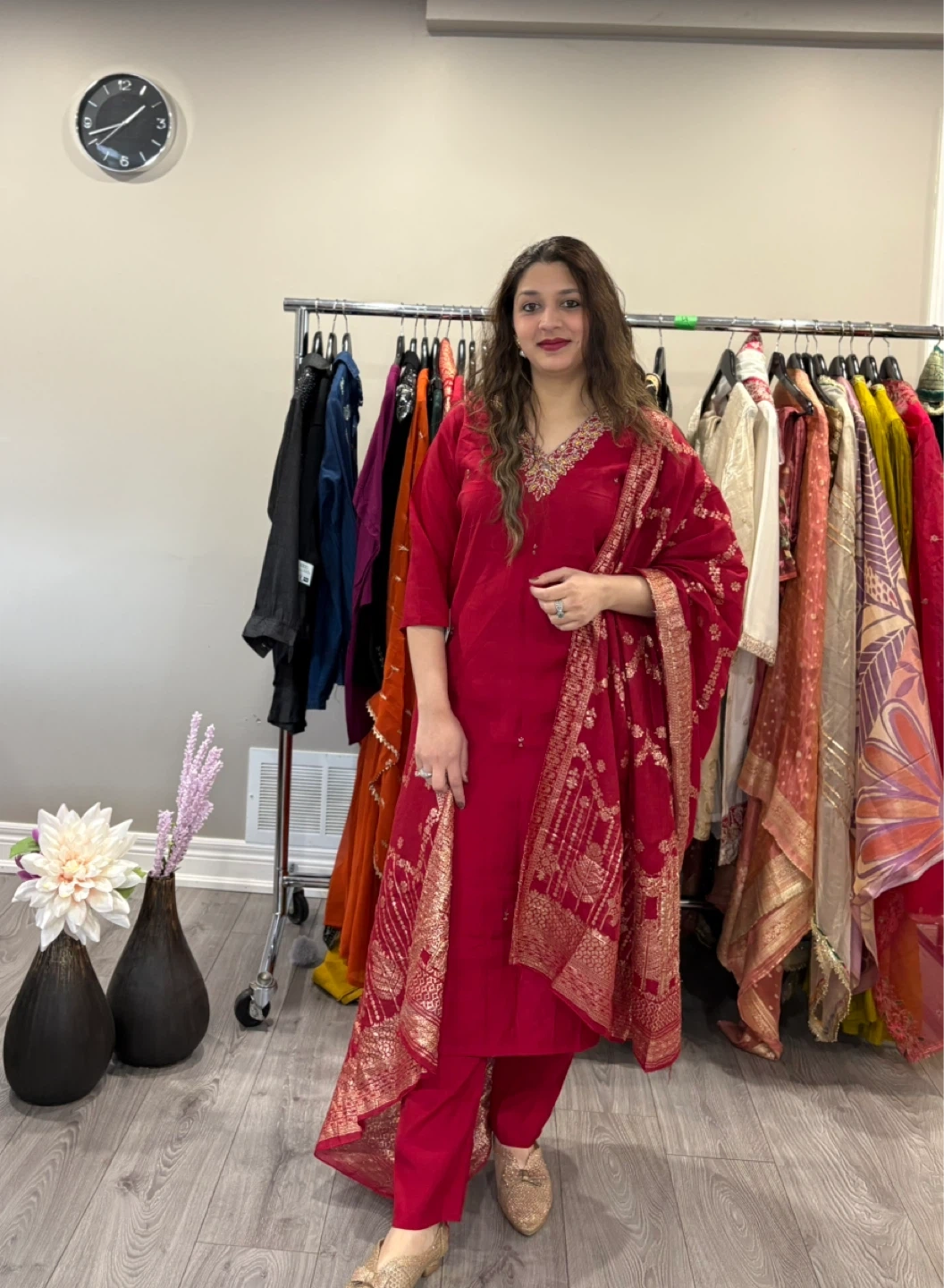 10A beautiful red suit, perfect for a special occasion or everyday wear. The intricate detailing on the dupatta adds a touch of elegance. Black Friday Sale 20%Off
