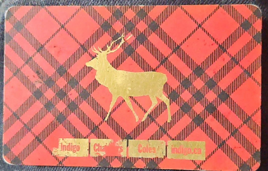 64Indigo giftcard with a plaid design and a golden deer. Perfect for gifting! VALUE ON INDIGO CARD: $100