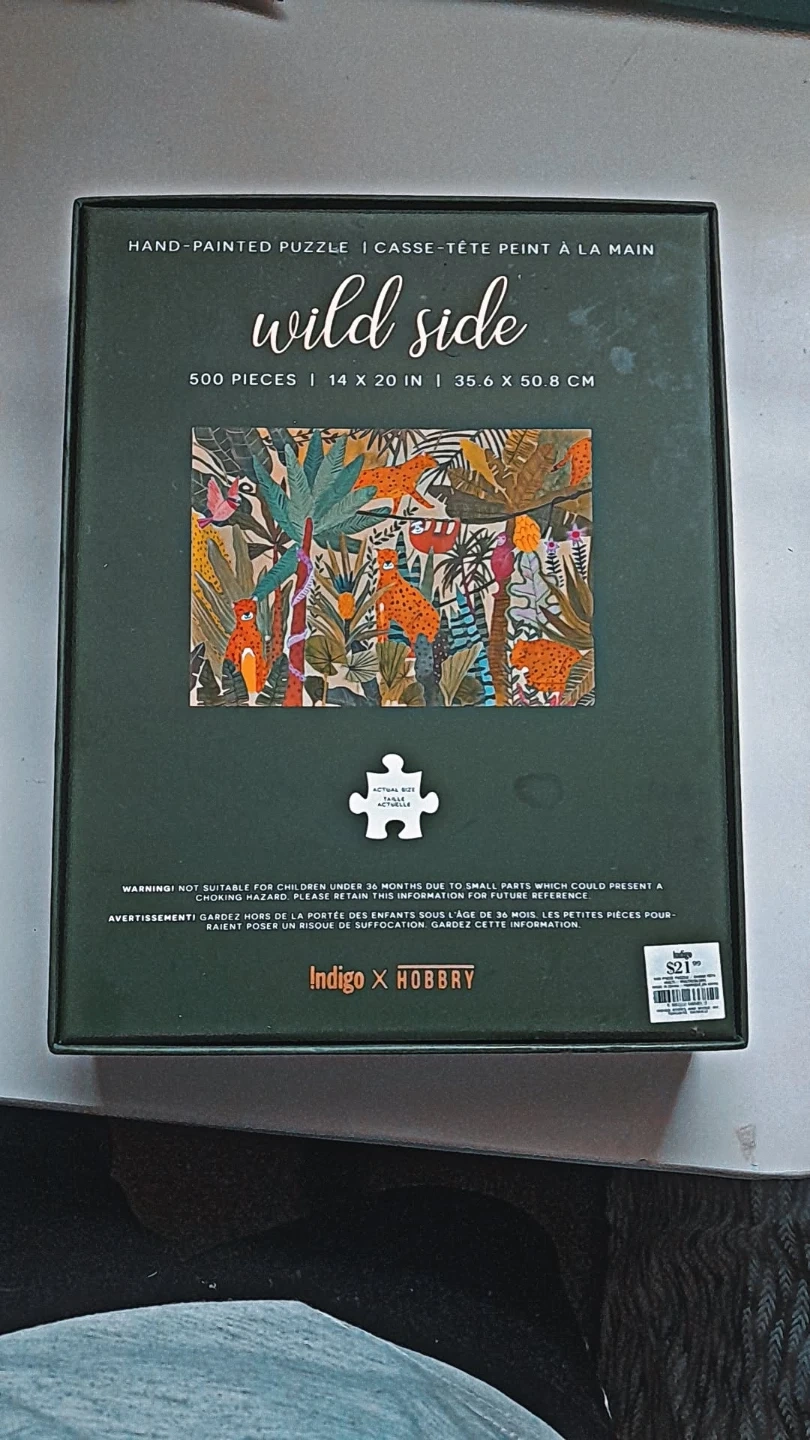 20This is a like new Indigo Wild Side 500 piece puzzle! It's a hand-painted puzzle and measures 14 x 20 inches (35.6 x 50.8 cm). Originally bought for 35