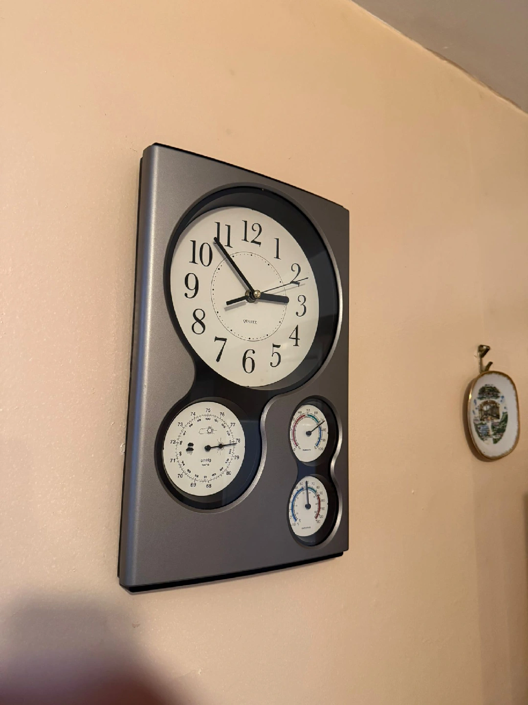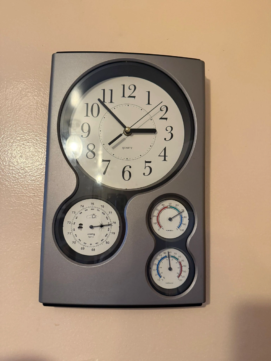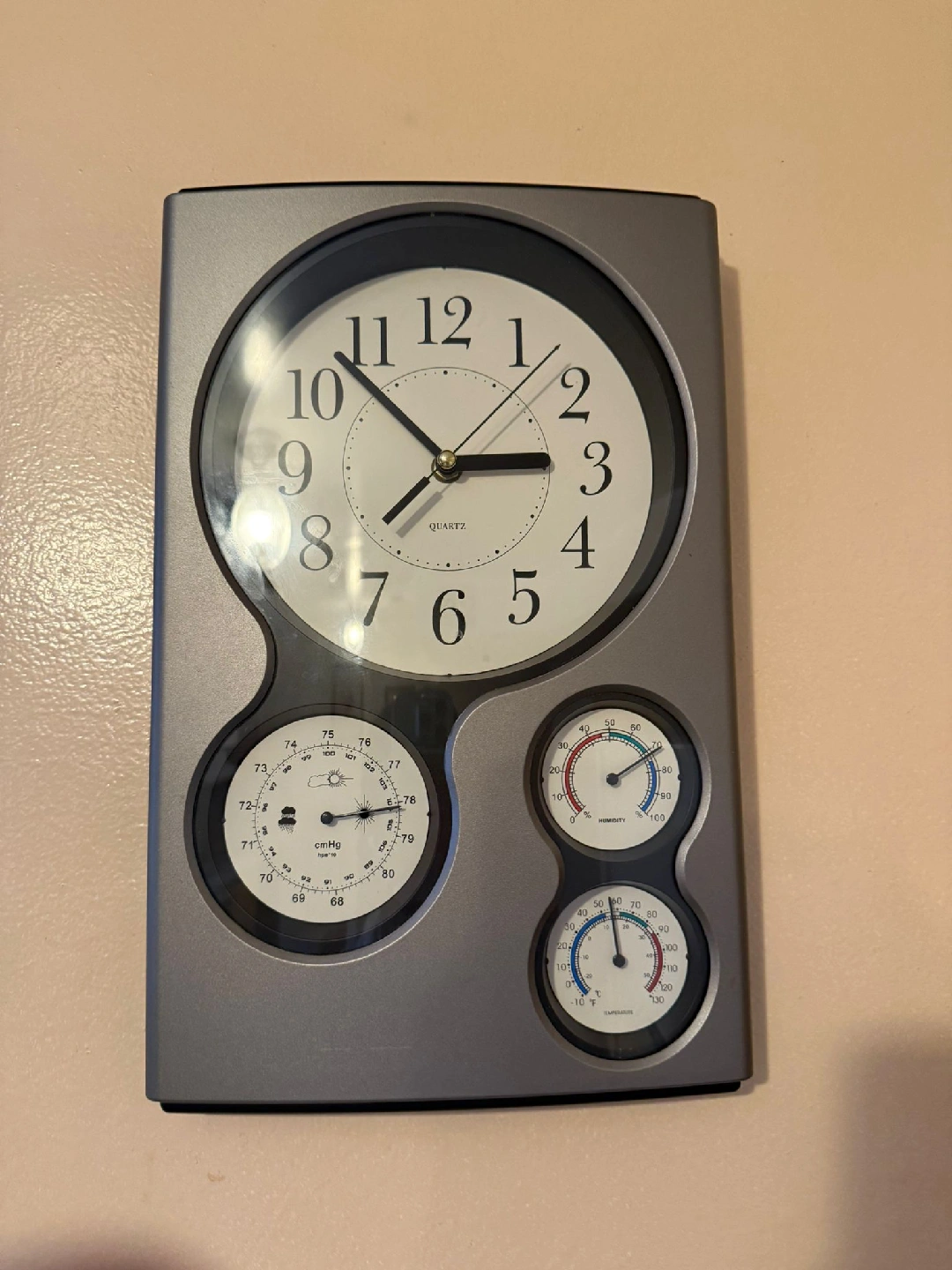 Keep track of time and the environment with this indoor/outdoor thermometer and hygrometer wall clock! It's in great condition and ready to hang in your home or garden