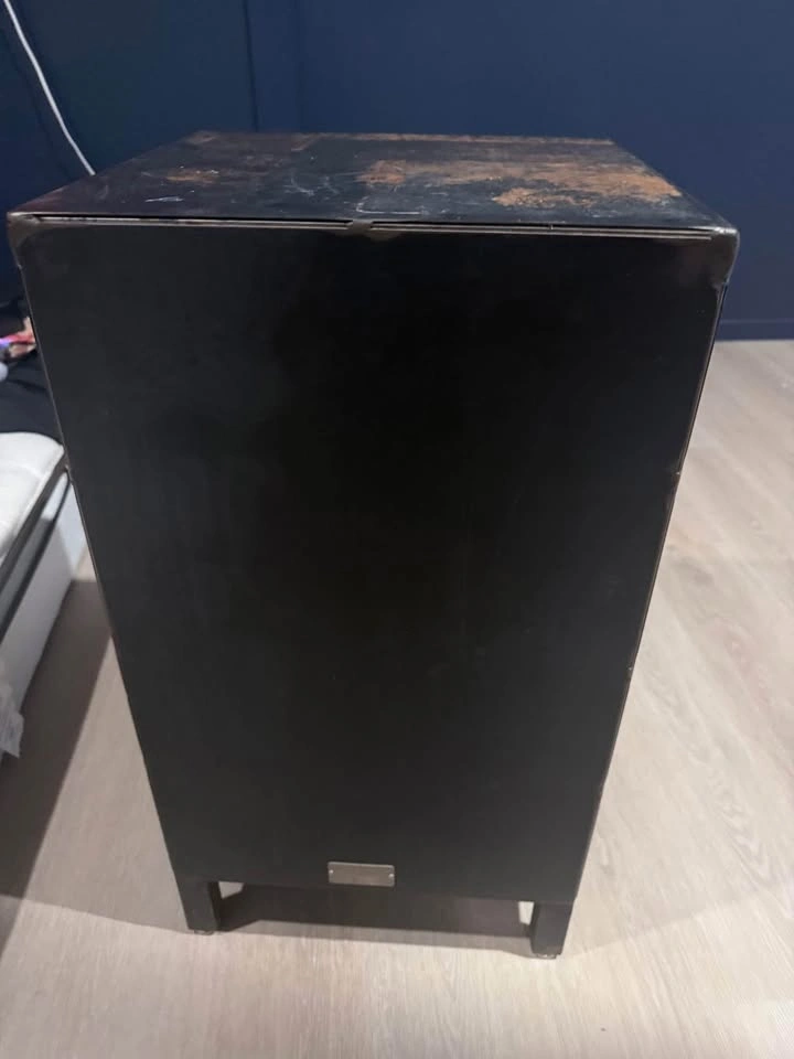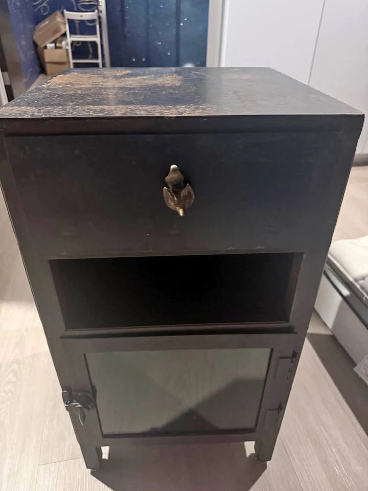 Unique Industrial Metal and Glass Nightstand/Cabinet. This is a fantastic, unique piece perfect for adding industrial, vintage, or steampunk style to any room! It works great as a bedside table, an accent cabinet in a living room, or entryway storage. Key Features: • Materials: Sturdy dark/black metal frame with a clear glass-paneled door. • Unique Patina: The top surface has a beautiful, heavily distressed bronze/rust patina (this is intentional for the vintage look and adds character). • Ornate Hardware: Features a unique, detailed knob and latch hardware that makes the piece stand out. • Storage: Includes one open shelf compartment for books or decor, and one lower enclosed cabinet with a glass door for dust-free display or storage.