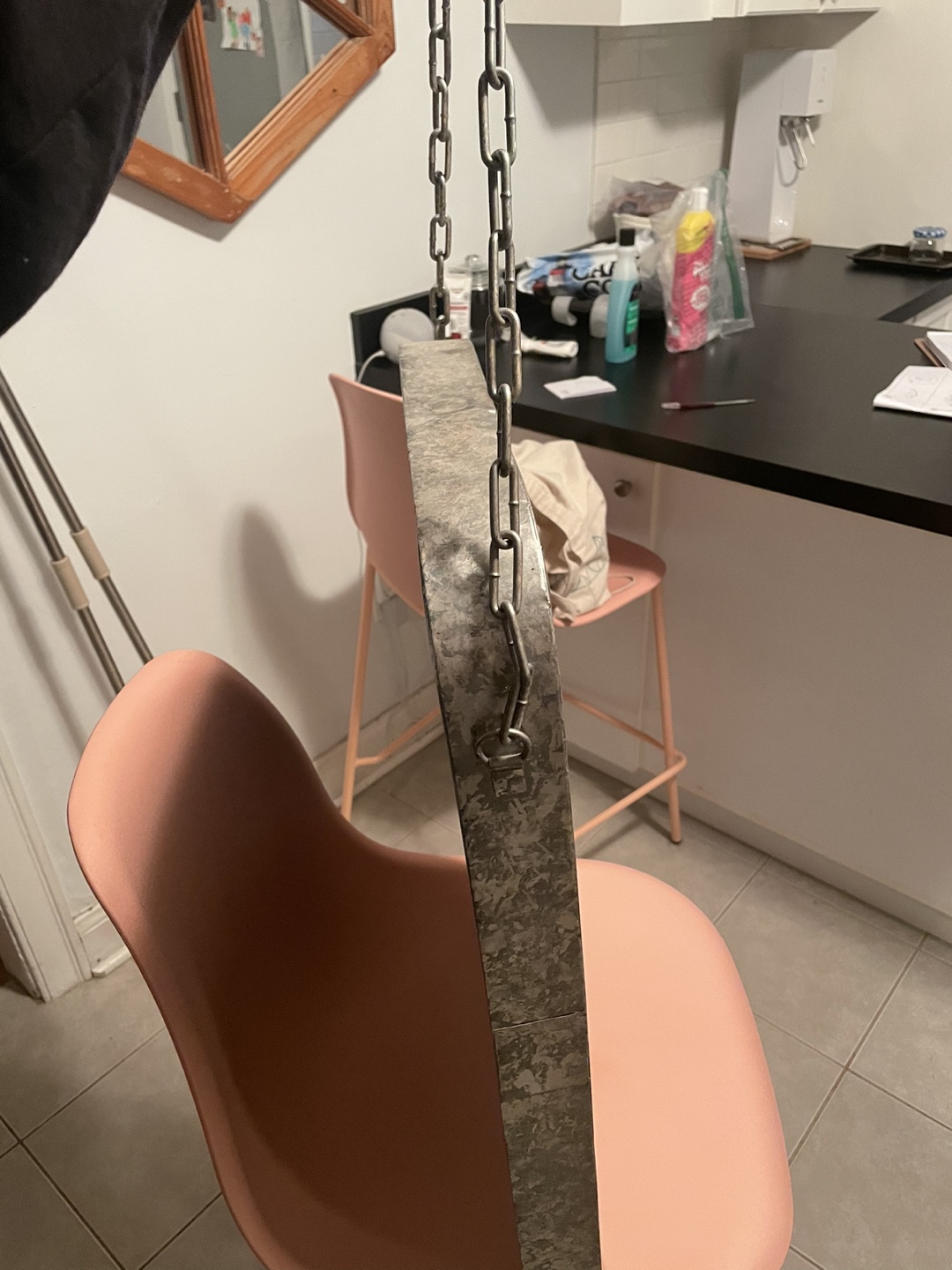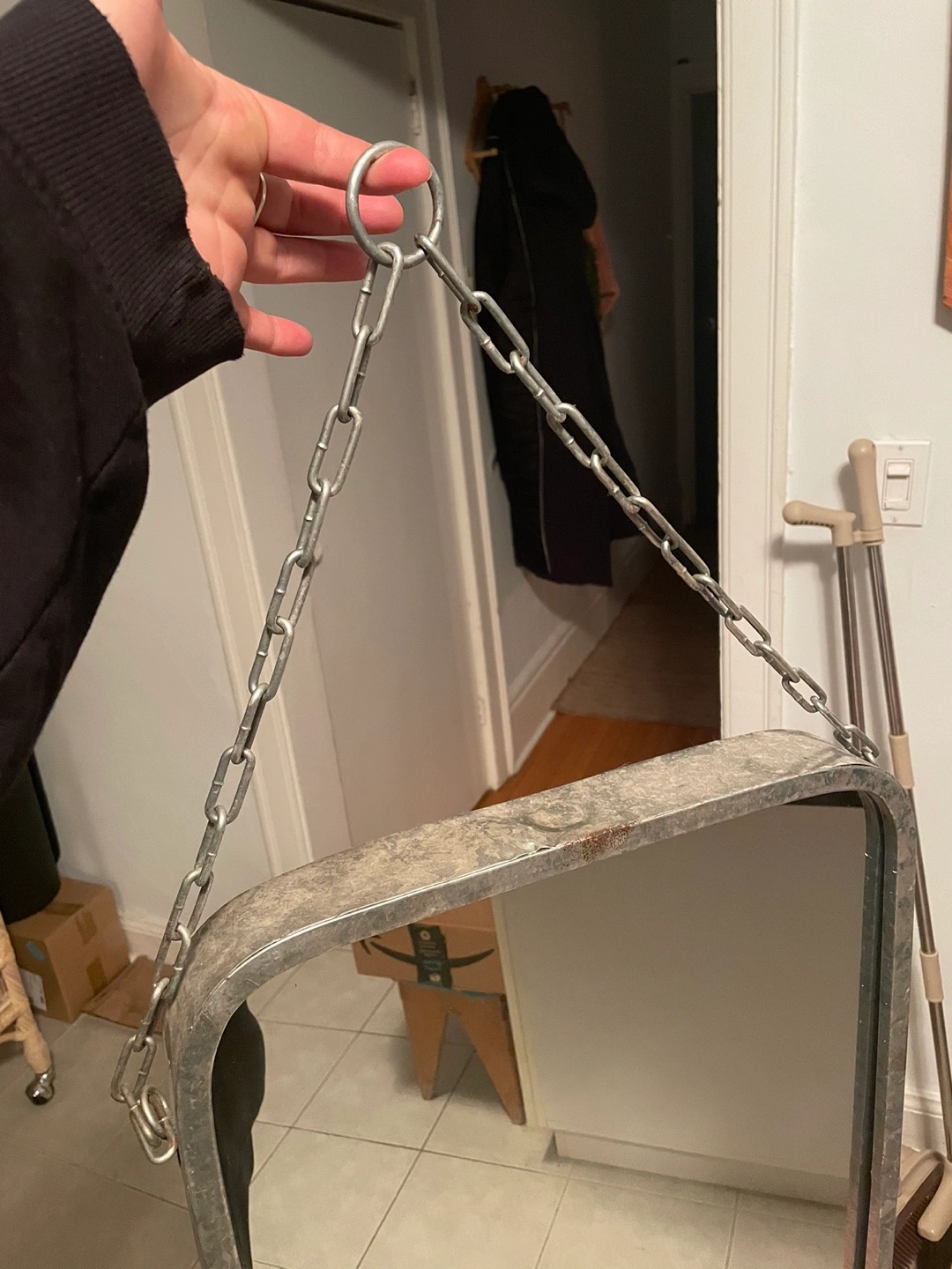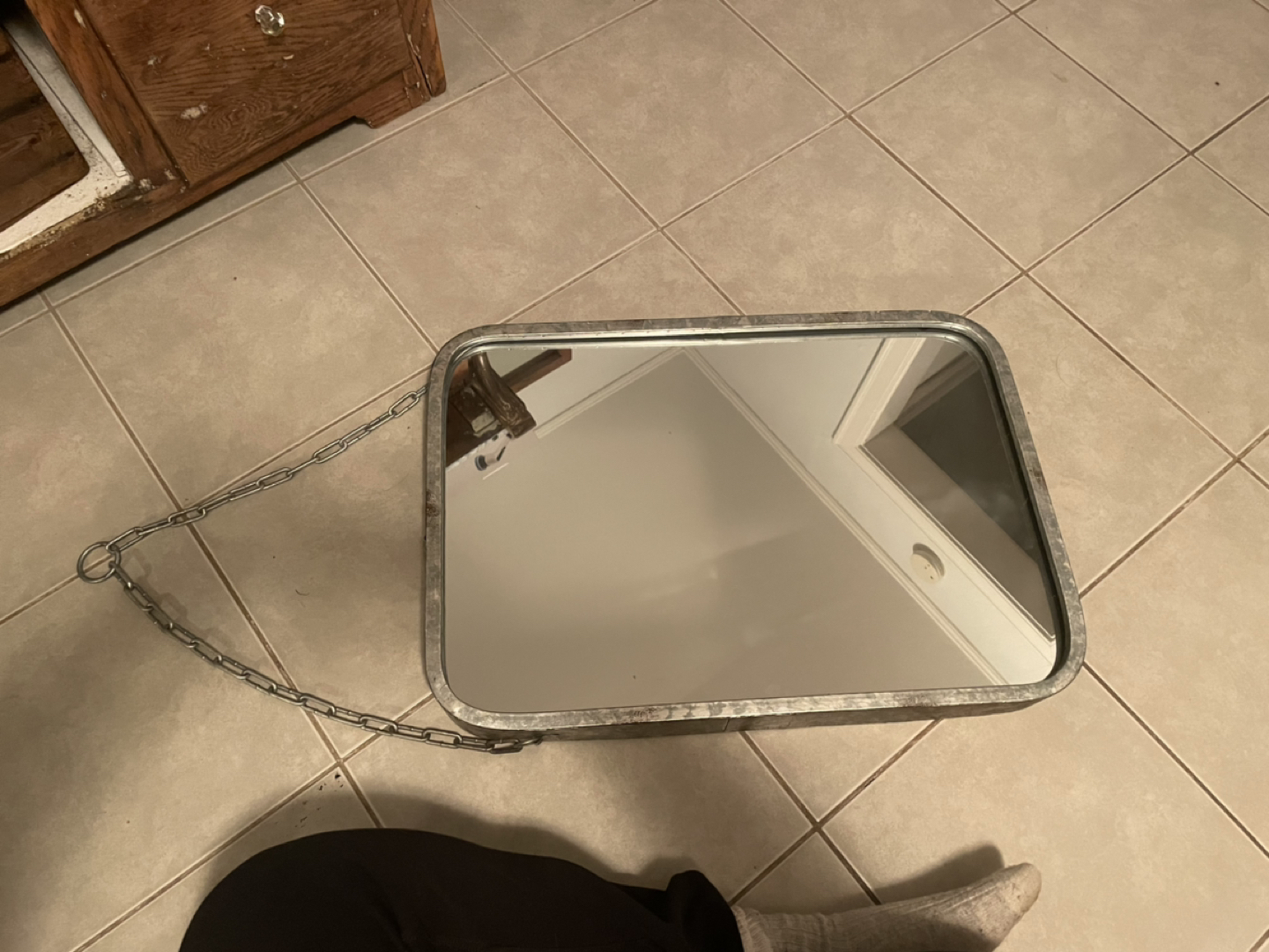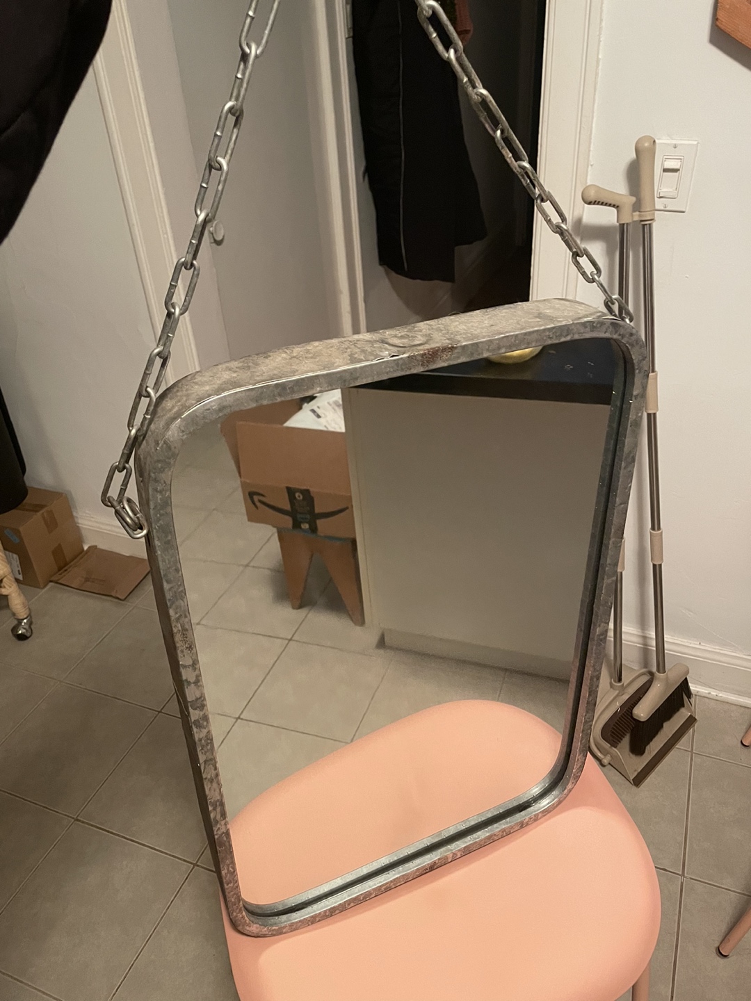This mirror is amazing, it’s very industrial looking with the chair and metal! I used it for years and changed in for a different look! L - mirror only 2 ft L With chain - 37.5” W- 16.5” No damage at all, very good condition 3-5 pounds (don’t have a scale- just adding in cause it’s not as heavy as it looks)