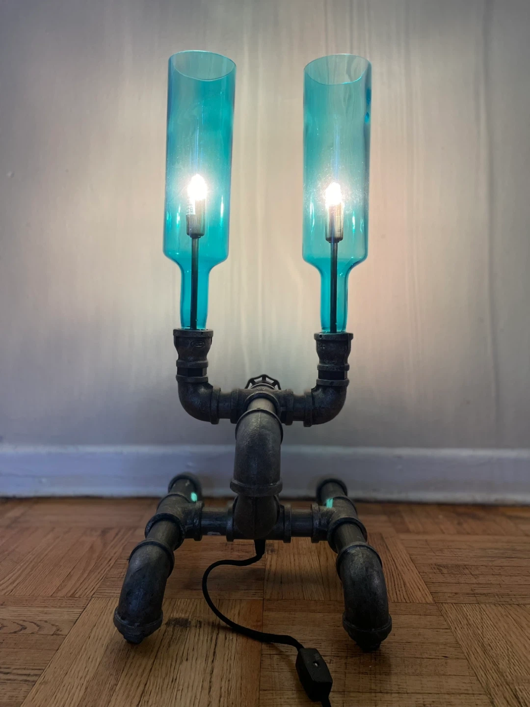 76Check out this unique industrial-style lamp! It features a cool pipe base and two blue glass shades. It's in great condition and would add a quirky touch to any room
