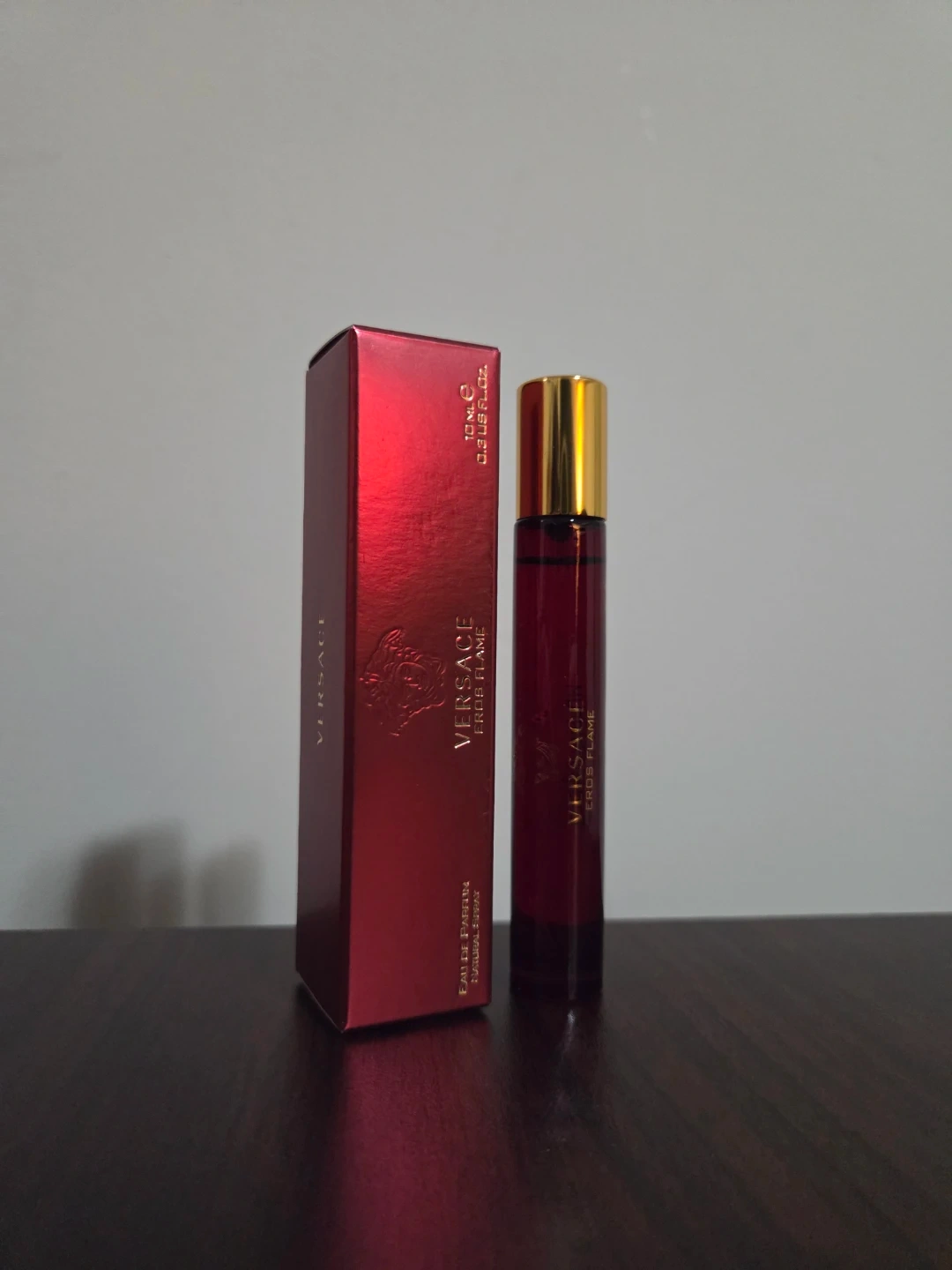 Authentic Versace Eros Flame Eau de Parfum in a compact miniature bottle, perfect for travel or sampling this bold fragrance. This scent is warm, spicy, and masculine with a vibrant blend of citrus, black pepper, and woody vanilla notes—ideal for evening wear or a confident signature scent.