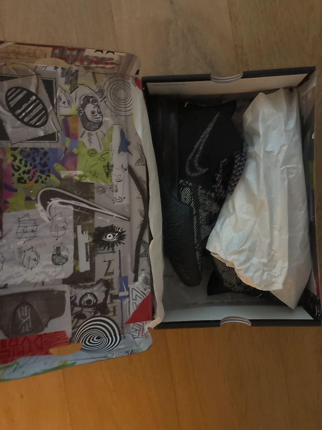These are black Nike sneakers that come in their original box. The shoes feature a distinctive patterned inner lining. Kyrie signature shoe
