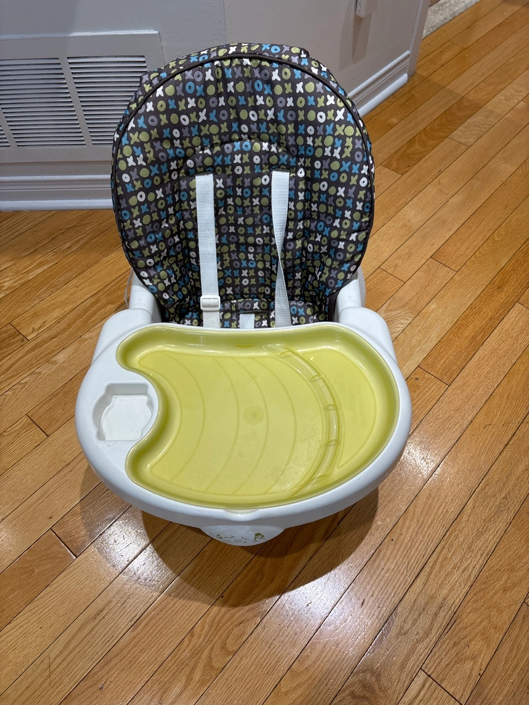 62Baby high chair, white and yellow tray, brown and green pattern seat. Adjustable straps. Used.