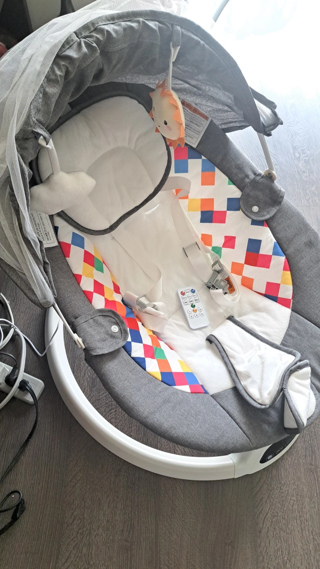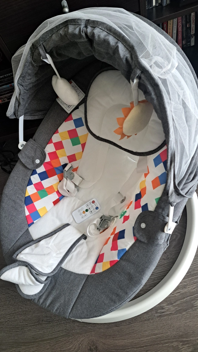 87Swing with an integrated canopy. Includes a remote for easy control. Features fun, colourful patterned seating. This swing is a wonderful tool for soothing your little one. It has 5 swing speeds, music option, a timer to stop and various parameters. Comes with instructions manual.