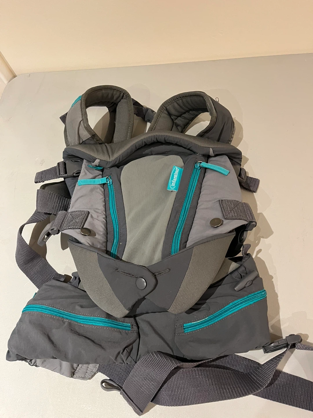 18Infantino baby carrier in great condition! It's grey and teal, and can be used in 4 different ways to carry your baby as they grow. - Facing-in folded seat (8-15 lbs) - Facing-in expanded seat (15-32 lbs) - Facing-out folded seat - Back carry expanded seat
