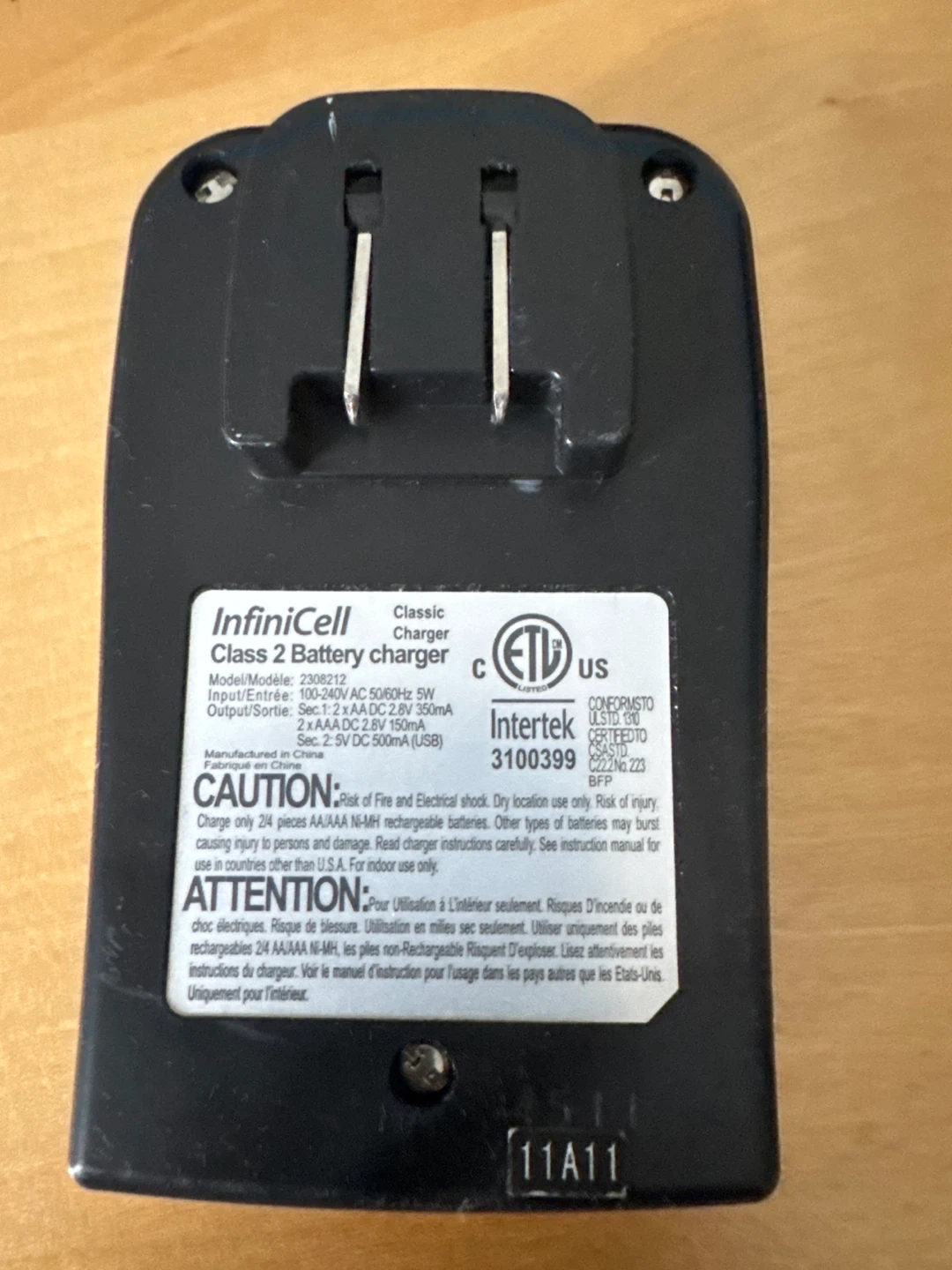 Selling an InfiniCell Classic Class 2 Battery Charger. It's a 5W charger with an input of 100-240V AC 50/60Hz and an output of 2 AAA/AA DC 2.8V 350mA or 2 AAAA/DC 2.8V 150mA or 2.5V DC 500mA (USB)