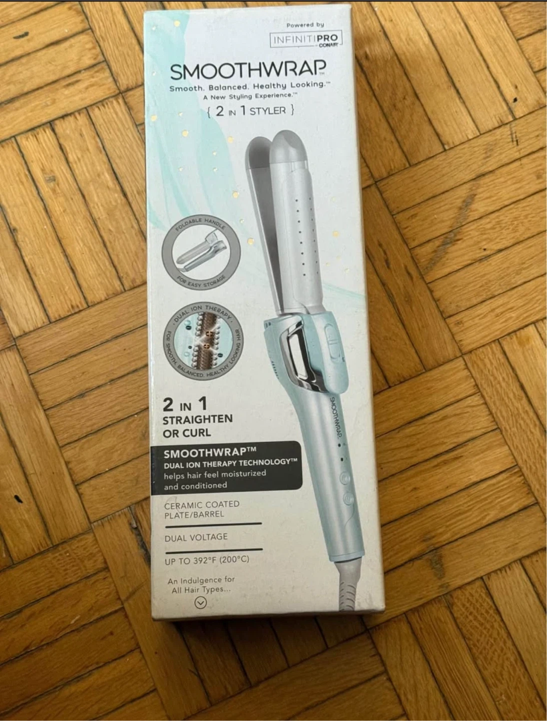 I'm selling an InfinitiPro Conair Smoothwrap 2-in-1 Styler! It's designed to both straighten and curl hair. It features smoothwrap dual ion therapy technology, which helps hair feel moisturized and conditioned. It also has a ceramic coated plate/barrel and dual voltage, up to 392°F (200°C). Comes with a foldable handle for easy storage