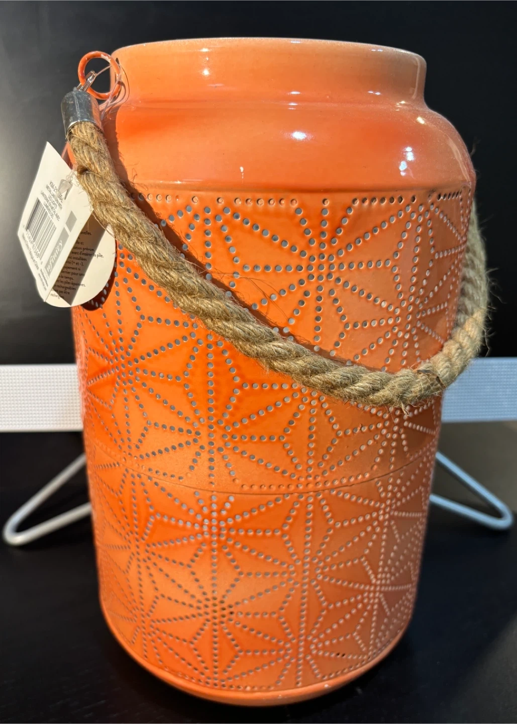 This is a cute orange metal lantern with a rope handle. It has a nice geometric pattern cut into the metal, letting light shine through. Perfect for adding a cozy touch to any room