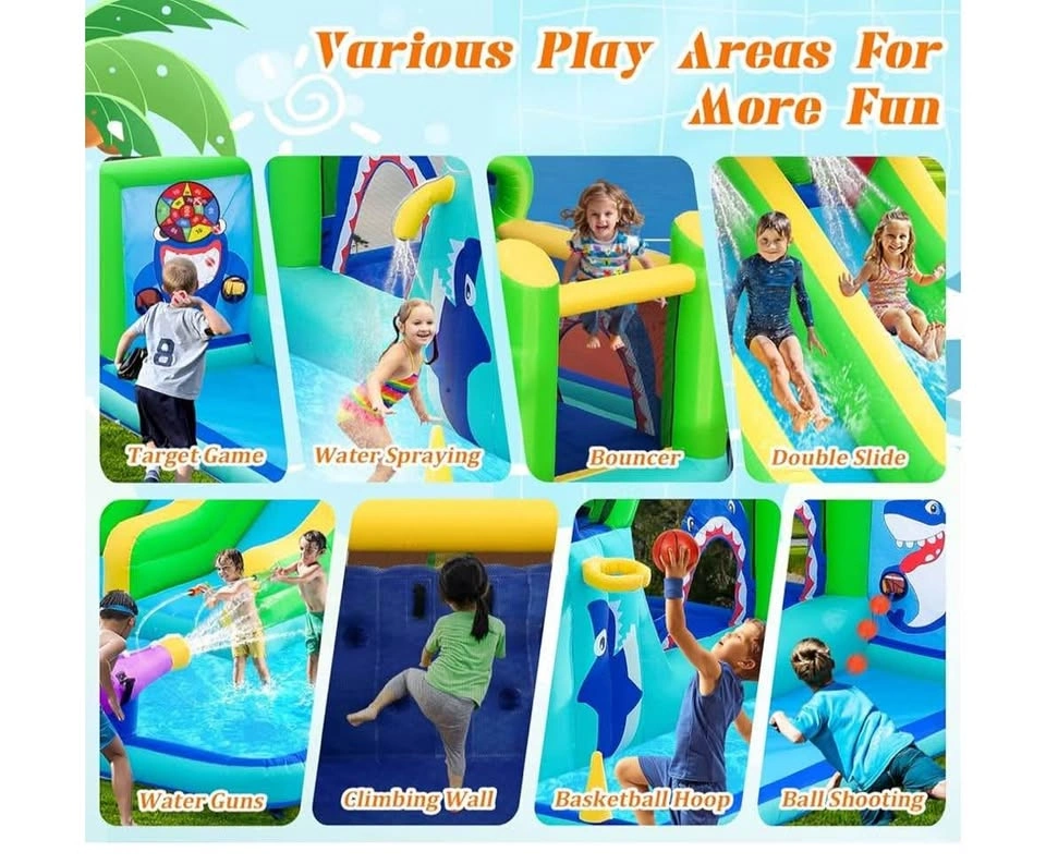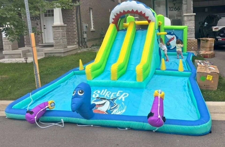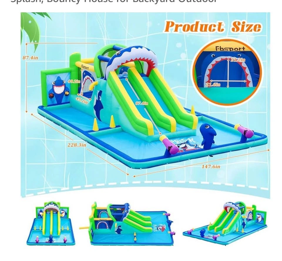 10Give me best offer! Regular price is $799. I used it once and not even with the water... it’s way too big for my yard! It’s in perfect condition. Hard to wrap up back in to the bag it came with. Special style with bright colors, our large inflatable bounce house is perfect for summer, birthday, party, festival and holidays. Can be used in backyards, lawns, gardens, and also indoors with water or ocean balls. Oversized pool where kids can play games and have water fights, they will have so much fun in our bounce castle Made of sturdy materials that can be used repeatedly and for a long time. Jumping and slide areas have raised guard nets to protect the children. It is suitable for 3-10 years old kids. Comes with 550W super-powerful blower, it can be quickly inflated for use The blower needs to be turned on all the time during use. To balance the air pressure and prevent the fabric from cracking, some of the streams of the bouncy castle will have air and water leakage, thanks for understanding, we take the safety of your children very seriously Double water slides, water guns, water cannons, sprinklers, jumping area, climbing wall, ball throwing, toss ring, darts, super large pool, all fun are included in our bouncy castle. Realize all your kid's wishes at once, let do exercise while having fun, this is their oversized playground It comes with a 550W air blower, 4 balls, 4 rings, 2 water guns, 1 dartboard, 1 pump, 8 stakes, water pipes, a repair kit, a manual, and a carrying bag. After deflating, roll up the bounce house and store it in the carrying bag for easy movement and storage. Includes all accessories and toys so kids can have a better time.