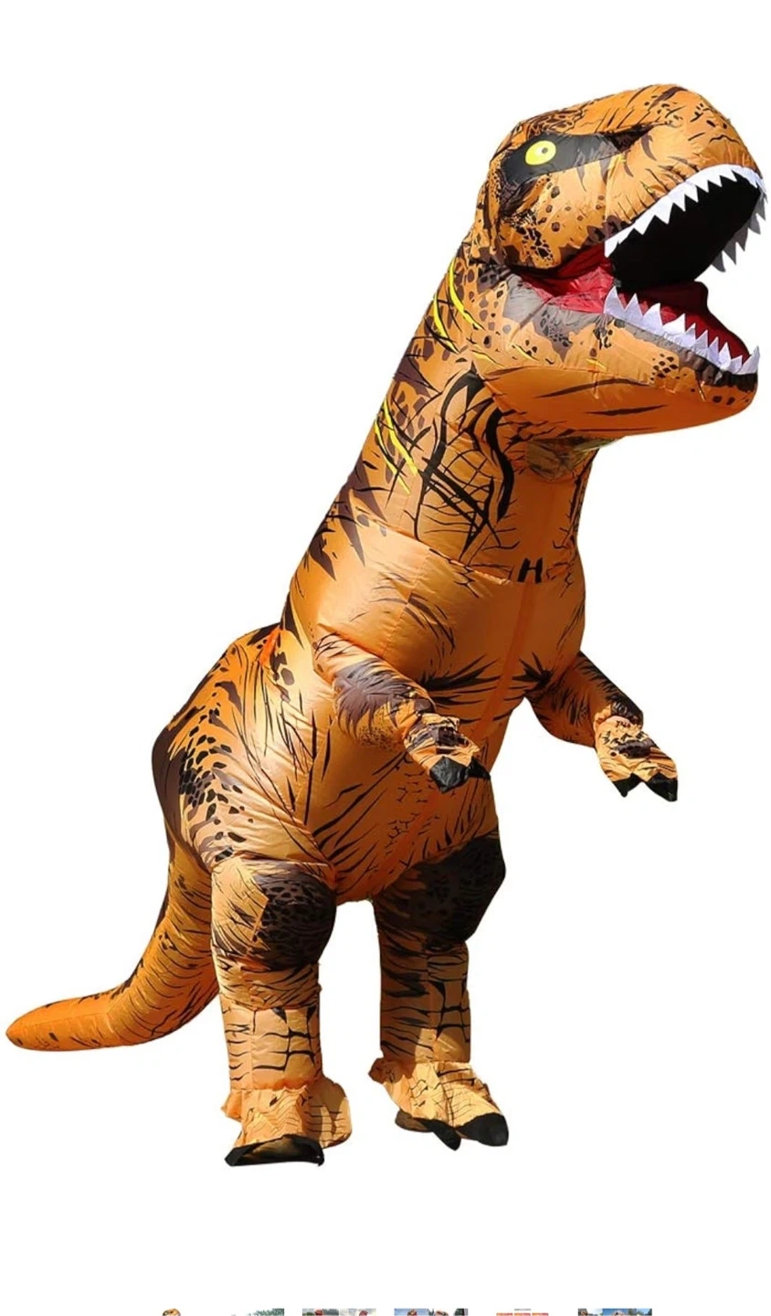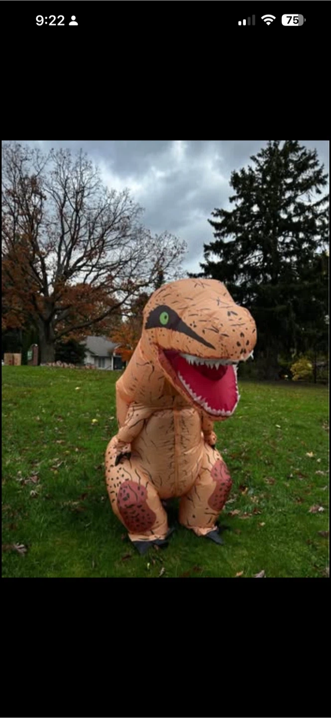 83Adult size used once last year we have 2 of them Get ready to roar with this fun inflatable T-Rex dinosaur costume! It's perfect for Halloween, costume parties, or just horsing around. The costume is in great condition and ready for its next adventure. It’s easy to inflate and wear, making you the star of any event