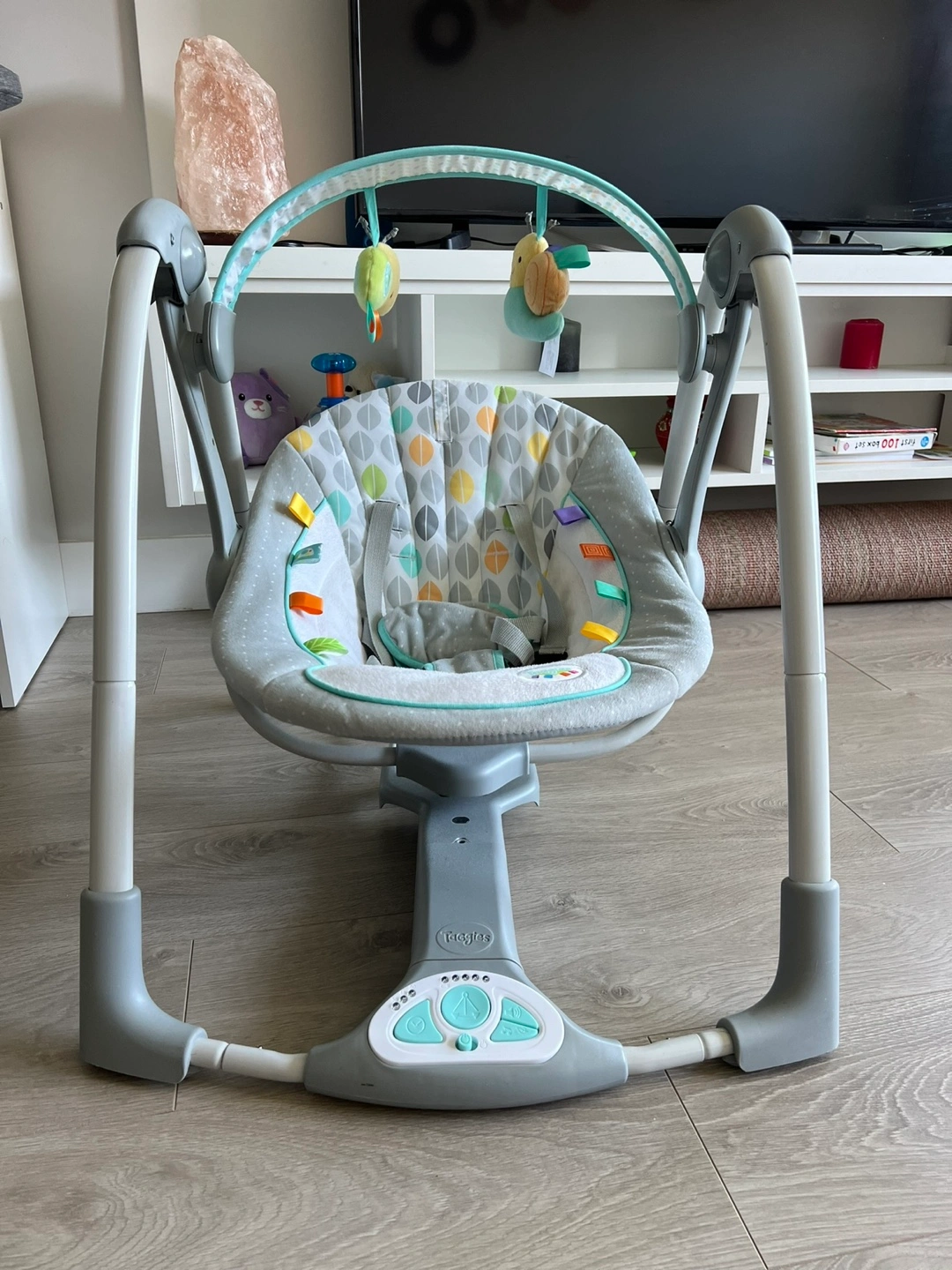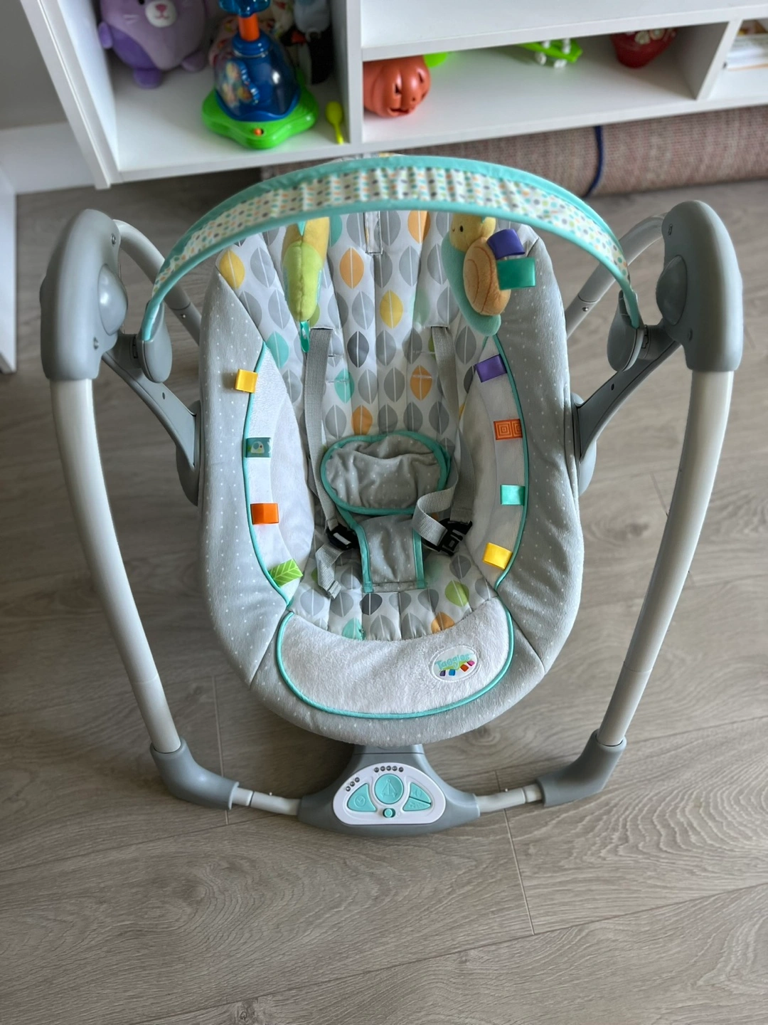 Baby swing, grey and teal colour scheme. Features multiple swing speeds and soothing vibrations. Includes overhead toy bar with plush toys. Gently used.