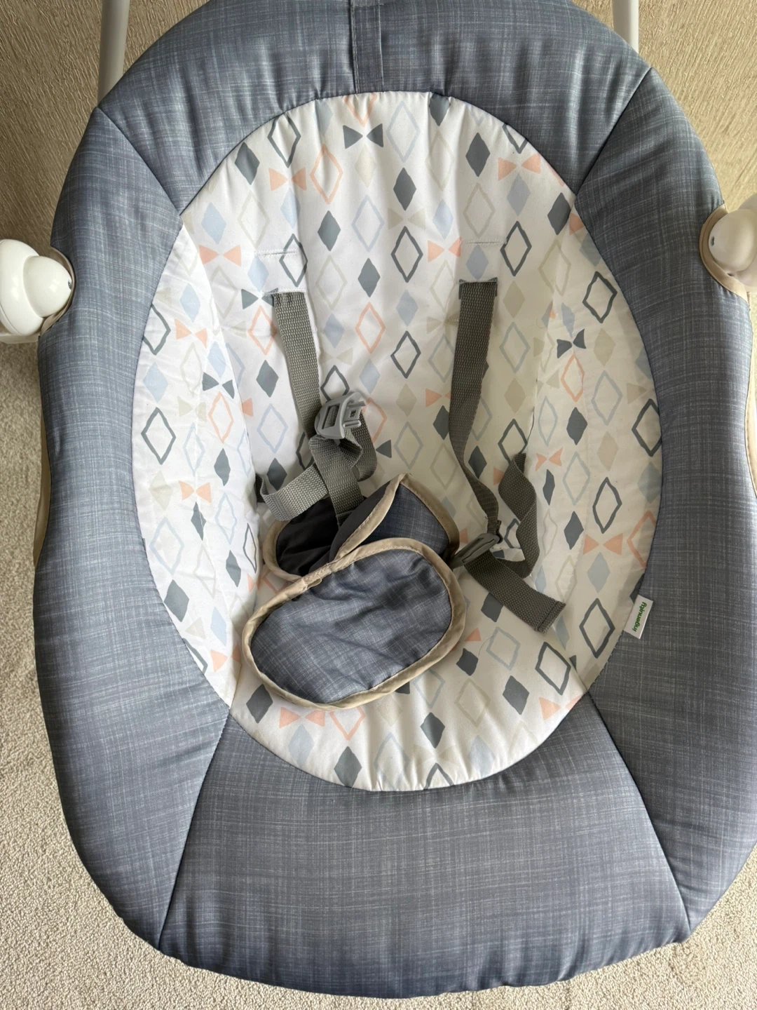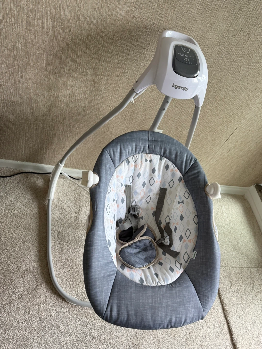 Selling an Ingenuity baby swing in great condition! It features multiple settings for sounds, music, and timer options. The seat has a cute grey and white patterned design with a safety harness. Perfect for keeping your little one comfy and entertained!