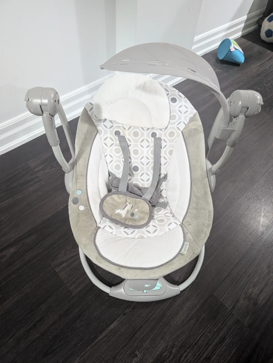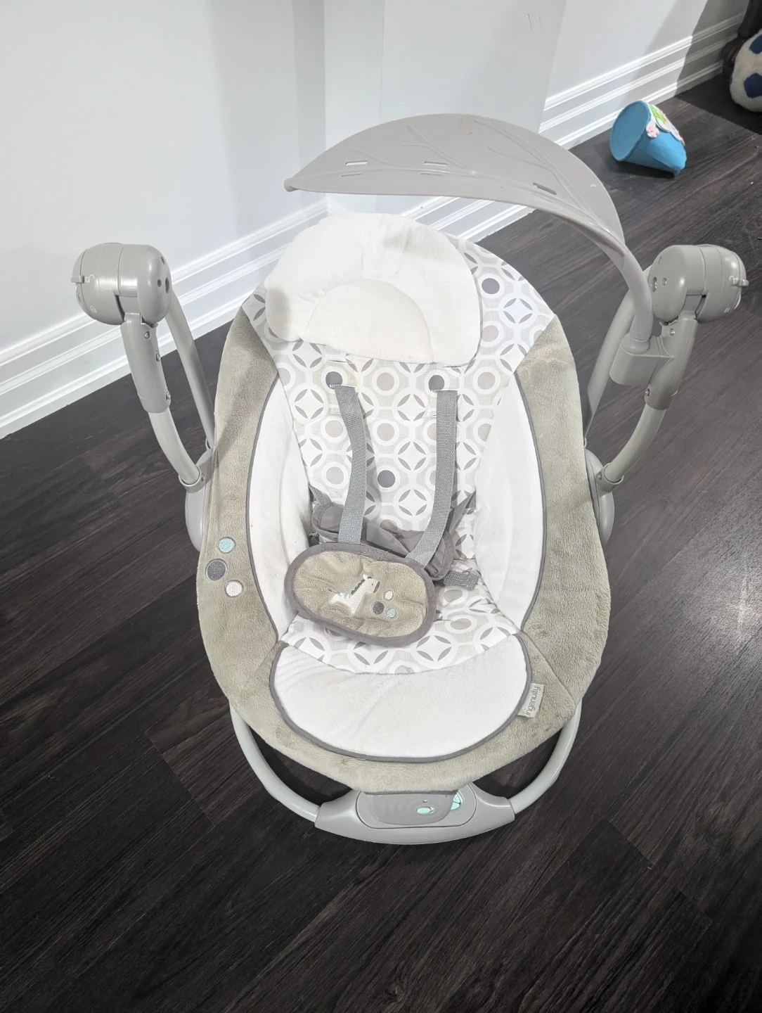 18Selling a gently used Ingenuity baby swing in a neutral grey colour. It's in great condition and ready for a new little one to enjoy! Perfect for soothing and entertaining your baby with gentle motions and sounds
