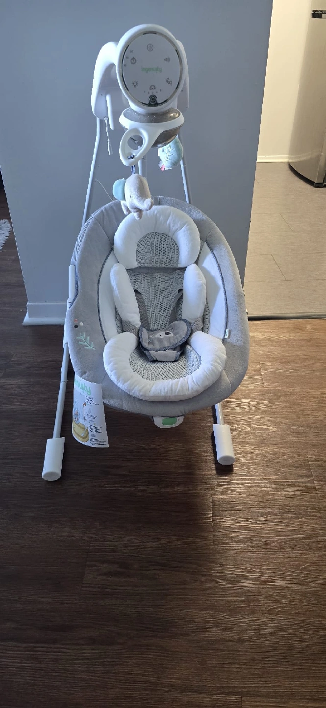Selling an Ingenuity baby swing in great condition! It's a comfy grey and white colour, perfect for soothing your little one. This swing has been gently used and is ready for a new home. The soft seat and gentle motion will help your baby relax and drift off to sleep