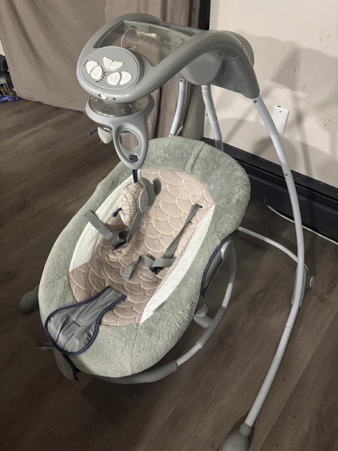 Selling an Ingenuity baby swing in great condition! It's grey and features a cute elephant toy. Perfect for soothing your little one and giving you a few free moments (missing cord)