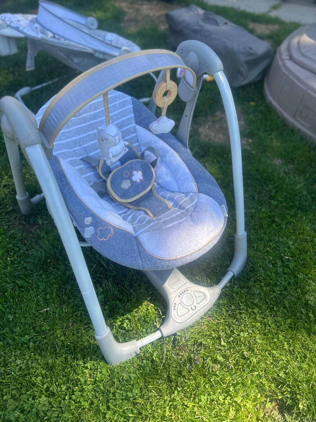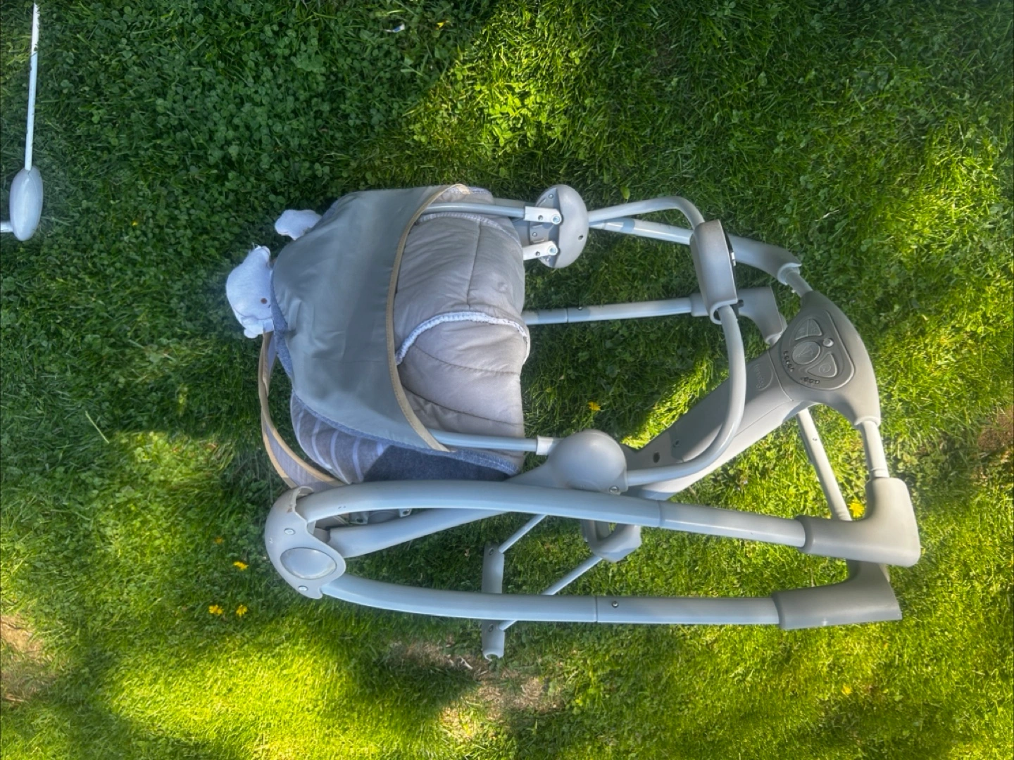 65Baby swing, grey and blue. Features multiple speeds and soothing sounds. Good condition, used gently. Includes toys. Folds for storage.