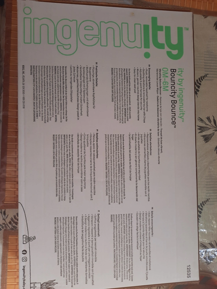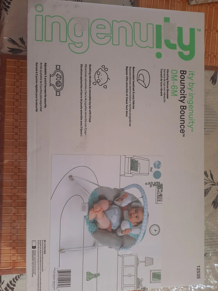 Lightly used baby bouncer. Suitable for newborns to infants. Features include a removable headrest, soft fabrics, soothing vibrations, and a toy bar. Compact and easy to store.